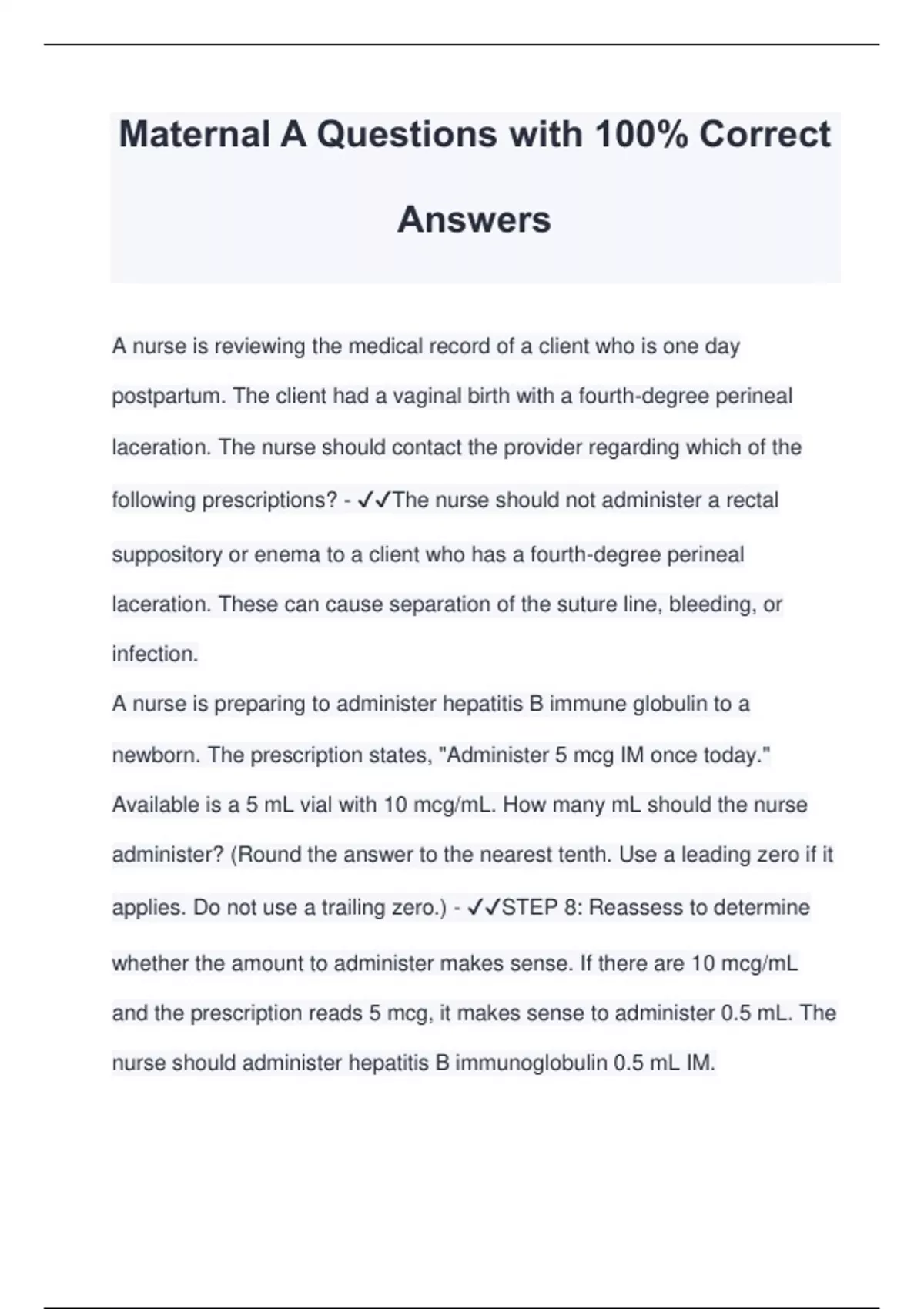 Maternal A Questions with 100% Correct Answers A nurse is reviewing the medical record of a client who is one day postpartum. The client had a vaginal birth with a fourth-degree perineal laceration. The nurse should contact the provider regarding which of the following prescriptions? - The nurse should not administer a rectal suppository or enema to a client who has a fourth-degree perineal laceration. These can cause separation of the suture line, bleeding, or infection. A nurse is preparing to administer hepatitis B immune globulin to a newborn. The prescription states, "Administer 5 mcg IM once today." Available is a 5 mL vial with 10 mcg/mL. How many mL should the nurse administer? (Round the answer to the nearest tenth. Use a leading zero if it applies. Do not use a trailing zero.) - STEP 8: Reassess to determine whether the amount to administer makes sense. If there are 10 mcg/mL and the prescription reads 5 mcg, it makes sense to administer 0.5 mL. The nurse should administer hepatitis B immunoglobulin 0.5 mL IM. A nurse is teaching a c