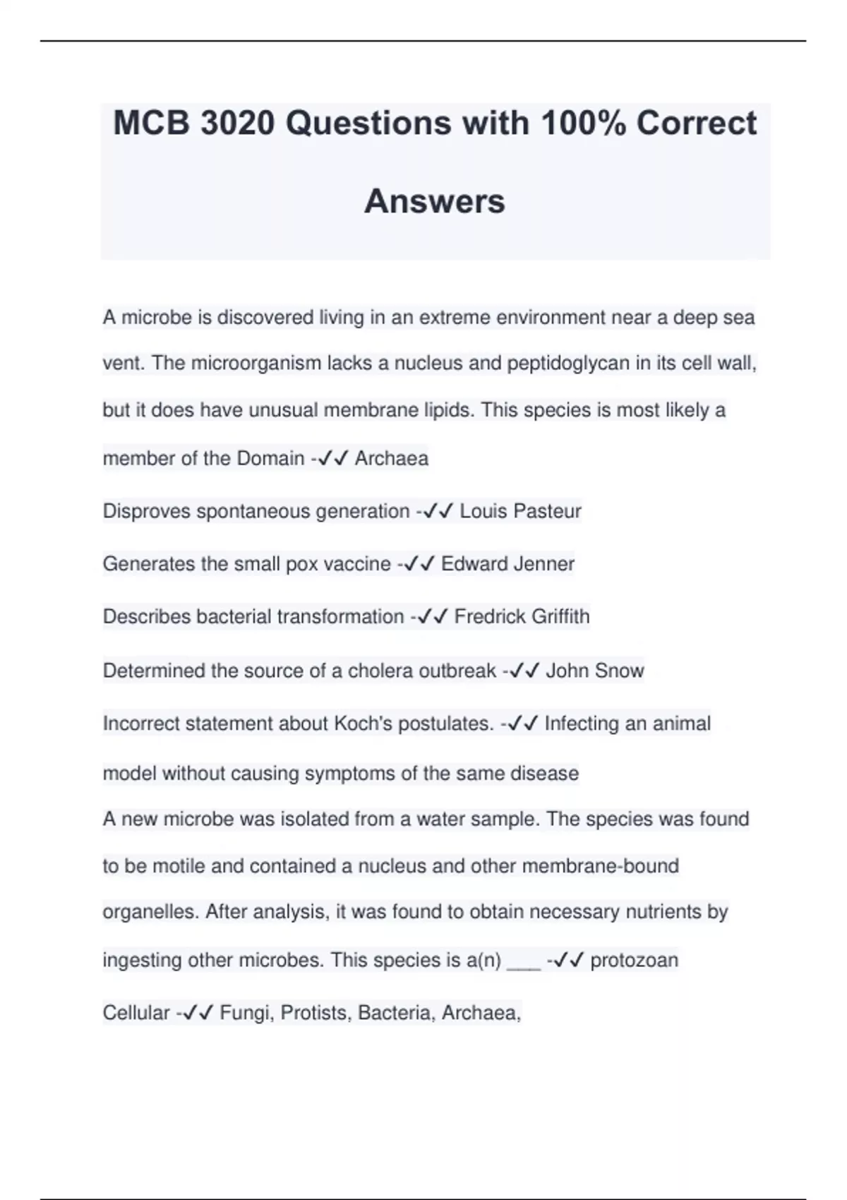 MCB 3020 Questions with 100% Correct Answers A microbe is discovered living in an extreme environment near a deep sea vent. The microorganism lacks a nucleus and peptidoglycan in its cell wall, but it does have unusual membrane lipids. This species is most likely a member of the Domain - Archaea Disproves spontaneous generation - Louis Pasteur Generates the small pox vaccine - Edward Jenner Describes bacterial transformation - Fredrick Griffith Determined the source of a cholera outbreak - John Snow Incorrect statement about Koch's postulates. - Infecting an animal model without causing symptoms of the same disease A new microbe was isolated from a water sample. The species was found to be motile and contained a nucleus and other membrane-bound organelles. After analysis, it was found to obtain necessary nutrients by ingesting other microbes. This species is a(n) ___ - protozoan Cellular - Fungi, Protists, Bacteria, Archaea,