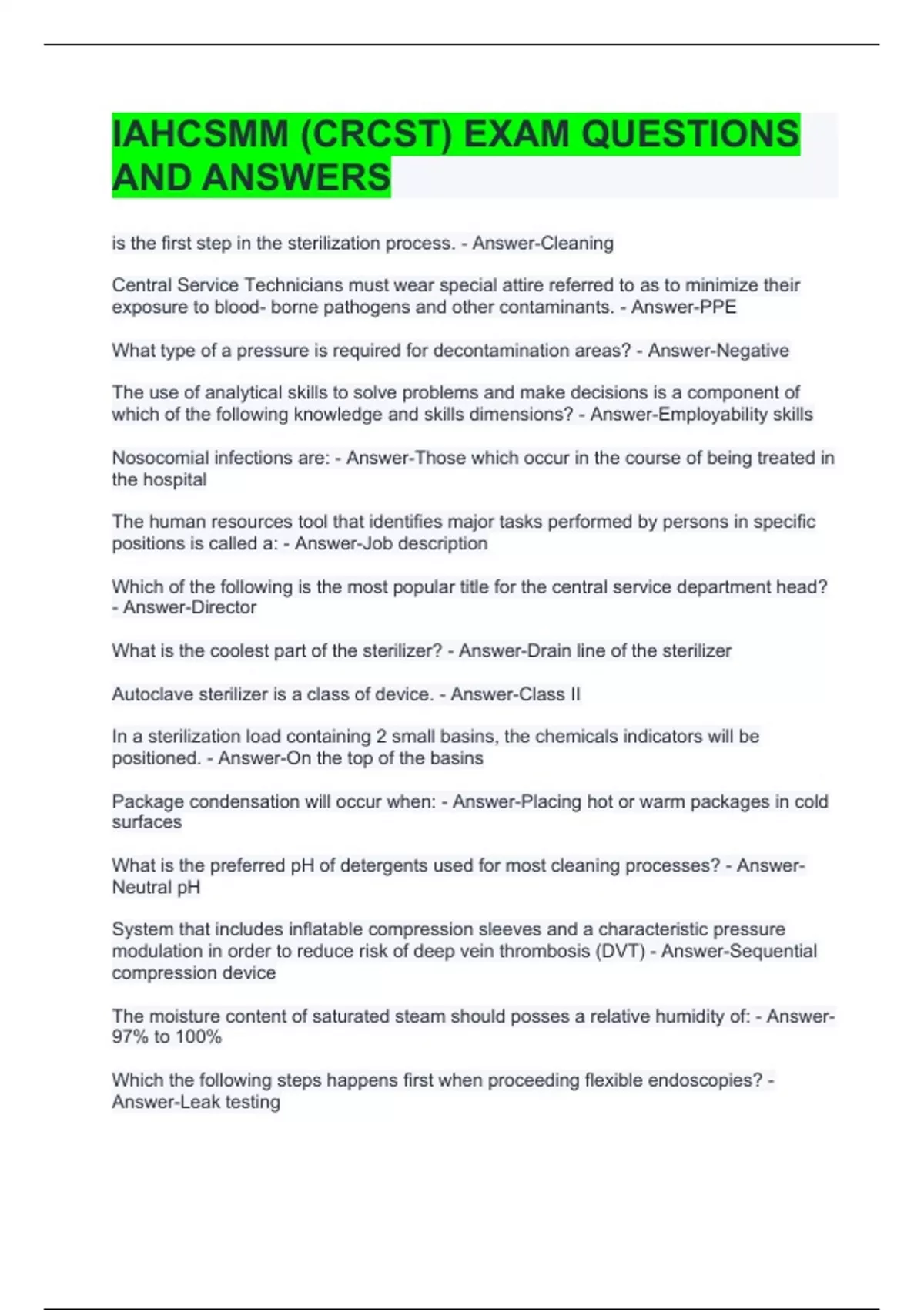 IAHCSMM (CRCST) EXAM QUESTIONS AND ANSWERS