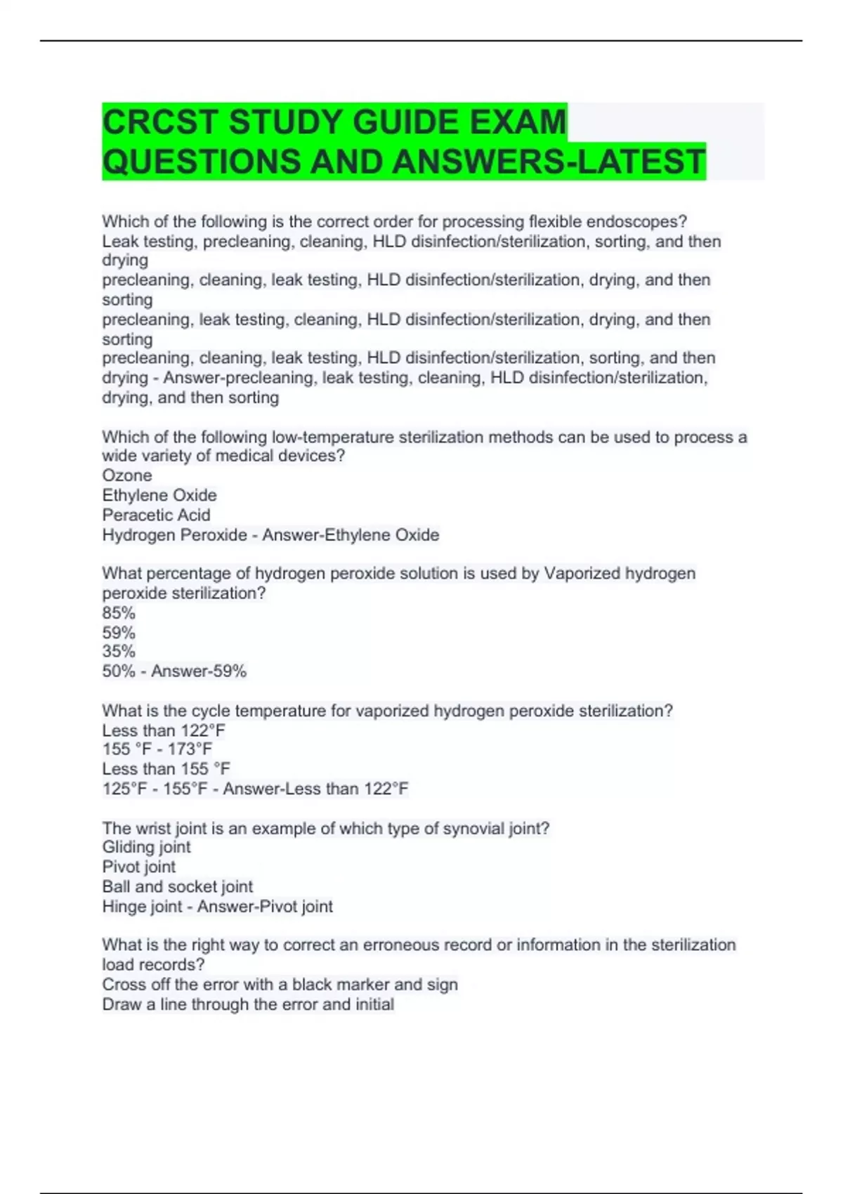 CRCST STUDY GUIDE EXAM QUESTIONS AND ANSWERS-LATEST The medical abbreviation ESS relates to... Surgical removal of the uterus The use of endoscopic instrumentation to operate on the nose The treatment of fractured bone without with surgical incision Hip joint reconstruction - Answer-The use of endoscopic instrumentation to operate on the nose The portion of the steam sterilizer that measures steam temp and automatically controls the flow of air and condensate from the sterilizer chamber. Thermometer Thermal probe Gasket Thermostatic trap - Answer-Thermostatic trap All of the following are objectives for sterilization packaging EXCEPT? To allow penetration of the chosen sterilant Must be compatible with all types of sterilization To be able to maintain the sterility of package contents until opened To create a package that can be opened without contaminating - Answer-Must be compatible with all types of sterilization The act of granting authority to employees so they may make decisions within their areas of responsibility. Empowerment Authorization Endorsement Incentive - Answer-Empowerment A band or sheet of fibrous connective tissue is the... Cartilage Tibia Fascia Tendon - Answer-Fascia The weakest part of a steam sterilizer is... Thermostatic trap Door Jacket Gasket - Answer-Door The bacterial spore used for monitoring ethylene oxide and dry heat sterilizations. Geobacillus stearothermophilus Bacillus subtills Bacillus atrophaeus Staphylococcus aureus - Answer-Bacillus atrophaeus