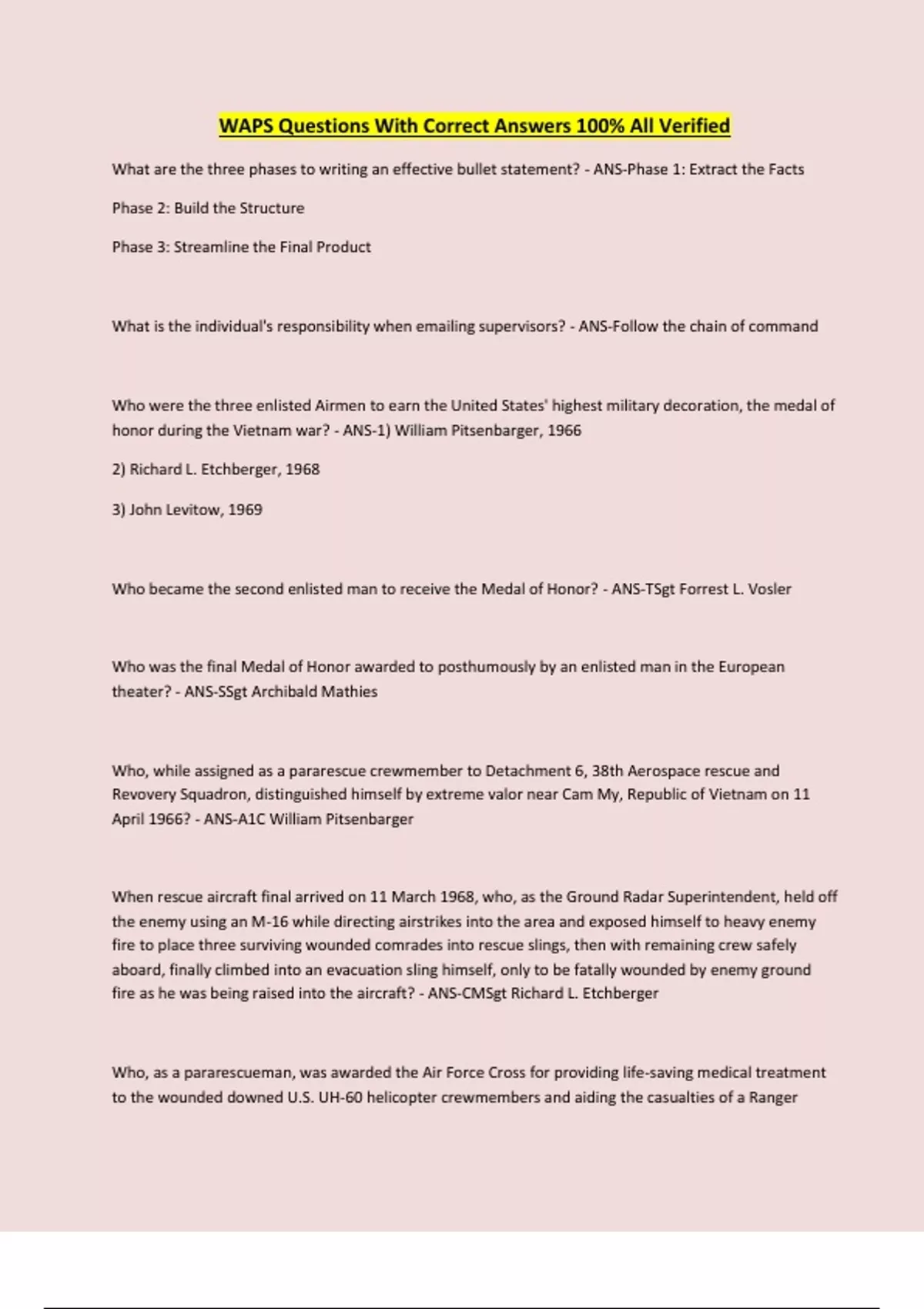 WAPS Questions With Correct Answers 100% All Verified What are the three phases to writing an effective bullet statement? - ANS-Phase 1: Extract the Facts Phase 2: Build the Structure Phase 3: Streamline the Final Product What is the individual's responsibility when emailing supervisors? - ANS-Follow the chain of command Who were the three enlisted Airmen to earn the United States' highest military decoration, the medal of honor during the Vietnam war? - ANS-1) William Pitsenbarger, 1966 2) Richard L. Etchberger, 1968 3) John Levitow, 1969 Who became the second enlisted man to receive the Medal of Honor? - ANS-TSgt Forrest L. Vosler Who was the final Medal of Honor awarded to posthumously by an enlisted man in the European theater? - ANS-SSgt Archibald Mathies Who, while assigned as a pararescue crewmember to Detachment 6, 38th Aerospace rescue and Revovery Squadron, distinguished himself by extreme valor near Cam My, Republic of Vietnam on 11 April 1966? - ANS-A1C William Pitsenbarger When rescue aircraft final arrived on 11 March 1968, who, as the Ground Radar Superintendent, held off the enemy using an M-16 while directing airstrikes into the area and exposed himself to heavy enemy fire to place three surviving wounded comrades into rescue slings, then with remaining crew safely aboard, finally climbed into an evacuation sling himself, only to be fatally wounded by enemy ground fire as he was being raised into the aircraft? - ANS-CMSgt Richard L. Etchberger Who, as a pararescueman, was awarded the Air Force Cross for providing life-saving medical treatment to the wounded downed U.S. UH-60 helicopter crewmembers and aiding the casualties of a Ranger security element engaged in an intense 18-hour firefight across an open four-way intersection in the streets of Mogadishu? - ANS-TSgt Timothy A. Wilkinson The operational chain of command runs from the President to the SECDEF and then to whom? - ANS-The combatant commanders Who provides the Chairman, Joint Chiefs of Staff with written policy guidance to prepare and review contingency plans? - ANS-The Secretary of Defense (SECDEF) What should personnel do when a natural disaster threatens or an incident affecting the base is imminent or in progress? - ANS-Listen for a 3-5 minute steady or wavering siren Keep the radio or TV on and listen for instructions from local authorities and weather updates Use the telephone for emergency calls only What is among the emerging transnational threats? - ANS-Terrorist threat or use of CBRNE material What is the definition of terrorism according to JP 1-02? - ANS-The calculated use of unlawful violence or threat to inculcate fear, intended to coerce or to intimidate governments or societies in the pursuit of goals that are generally political, religious, or ideological. What exists to ensure use of force in an operation occurs according to national policy goals, mission requirements and the rule of law? - ANS-Rules of Engagement What are the ROE parameters set for? - ANS-When, where, how, why and against whom commanders and their Airmen may use force Members who violate Prohibited Activities are subject to disciplinary action under what article of the UCMJ? - ANS...
