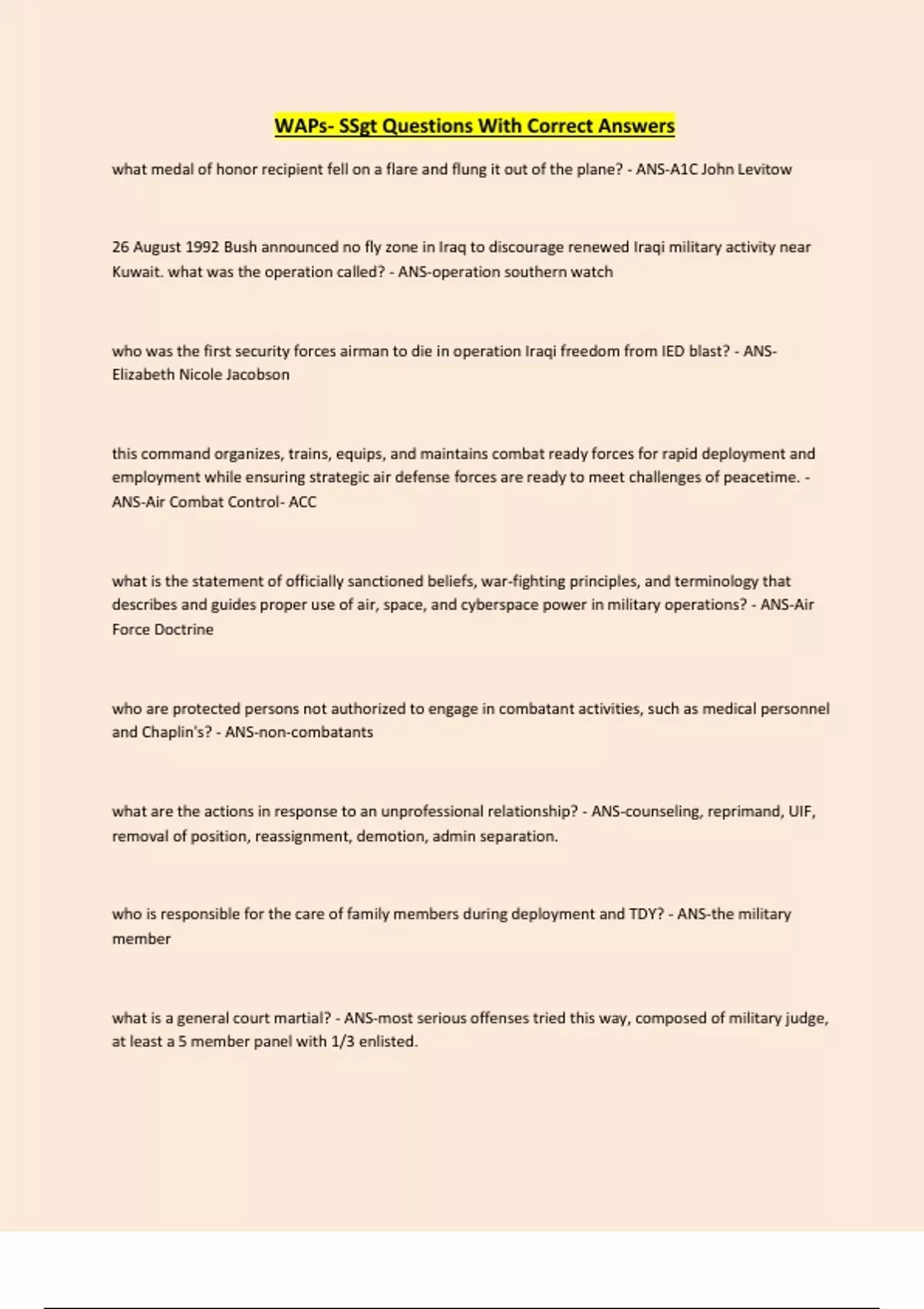WAPs- SSgt Questions With Correct Answers what medal of honor recipient fell on a flare and flung it out of the plane? - ANS-A1C John Levitow 26 August 1992 Bush announced no fly zone in Iraq to discourage renewed Iraqi military activity near Kuwait. what was the operation called? - ANS-operation southern watch who was the first security forces airman to die in operation Iraqi freedom from IED blast? - ANSElizabeth Nicole Jacobson this command organizes, trains, equips, and maintains combat ready forces for rapid deployment and employment while ensuring strategic air defense forces are ready to meet challenges of peacetime. - ANS-Air Combat Control- ACC what is the statement of officially sanctioned beliefs, war-fighting principles, and terminology that describes and guides proper use of air, space, and cyberspace power in military operations? - ANS-Air Force Doctrine who are protected persons not authorized to engage in combatant activities, such as medical personnel and Chaplin's? - ANS-non-combatants what are the actions in response to an unprofessional relationship? - ANS-counseling, reprimand, UIF, removal of position, reassignment, demotion, admin separation. who is responsible for the care of family members during deployment and TDY? - ANS-the military member what is a general court martial? - ANS- Continues...