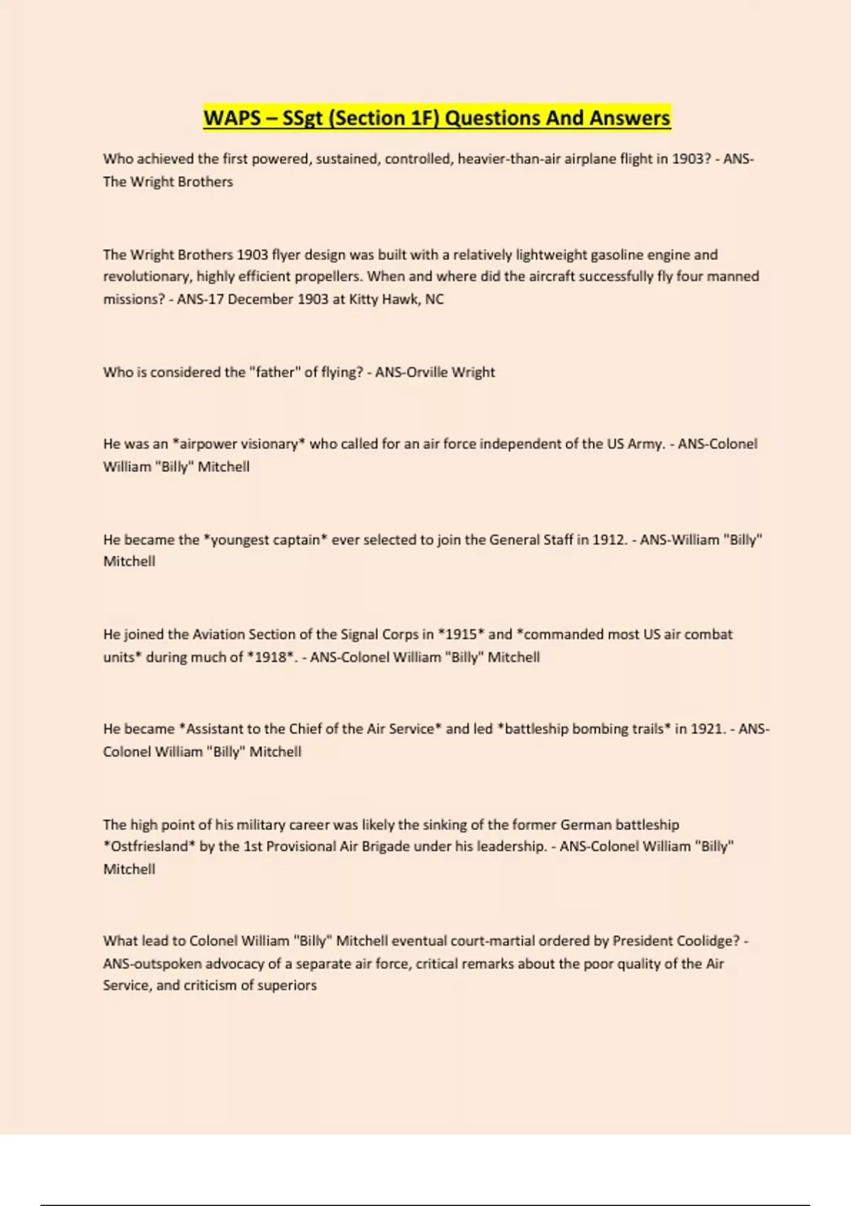 WAPS – SSgt (Section 1F) Questions And Answers Who achieved the first powered, sustained, controlled, heavier-than-air airplane flight in 1903? - ANSThe Wright Brothers The Wright Brothers 1903 flyer design was built with a relatively lightweight gasoline engine and revolutionary, highly efficient propellers. When and where did the aircraft successfully fly four manned missions? - ANS-17 December 1903 at Kitty Hawk, NC Who is considered the "father" of flying? - ANS-Orville Wright He was an *airpower visionary* who called for an air force independent of the US Army. - ANS-Colonel William "Billy" Mitchell He became the *youngest captain* ever selected to join the General Staff in 1912. - ANS-William "Billy" Mitchell He joined the Aviation Section of the Signal Corps in *1915* and *commanded most US air combat units* during much of *1918*. - ANS-Colonel William "Billy" Mitchell He became *Assistant to the Chief of the Air Service* and led *battleship bombing trails* in 1921. - ANSColonel William "Billy" Mitchell The high point of his military career was likely the sinking of the former German battleship *Ostfriesland* by the 1st Provisional Air Brigade under his leadership. - ANS-Colonel William "Billy" Mitchell What lead to Colonel William "Billy" Mitchell eventual court-martial ordered by President Coolidge? - ANS-outspoken advocacy of a separate air force, critical remarks about the poor quality of the Air Service, and criticism of superiors He was a *pioneer aviator* and the *first commander* of an American air unit in the field. - ANS-Major General Benjamin D. "Benny" Foulois He entered the Aviation Section of the Signal Corps in *1907* and participated in the acceptance tests of the *Army's first semirigid dirigible* and it's first airplane, a Wright flyer designated Signal Corps No. 1, in 1908 and 1909. - ANS-Major General Benjamin D. "Benny" Foulois *He* completed the organization of the *Army's first* operational unit, the *1st Aero Squadron*, in 1915. - ANS-Major General Benjamin D. "Benny" Foulois He *commanded the 1st Aero Squadron* during the *Mexican Punitive Expedition from * (the first deployment of a US Army air unit to the field). - ANS-Major General Benjamin D. "Benny" Foulois He played a major role in *planning* and implementing the *$640 million aviation program* started after the US entered WWI. - ANS-Major General Benjamin D. "Benny" Fuolois He was promoted to brigadier general and named *Chief of the Air Service for the American Expeditionary Force in 1917*, but was replaced by *General Patrick* six months later. - ANS-Major General Benjamin D. "Benny" Foulois He became Assistant Chief of the Air Service in 1927 and was promoted to major general and named Chief of the Air Corps 1931. - ANS-Major General Benjamin D. "Benny" Foulois In 1934, whose reputation was damaged when he agreed that the Air Corps could fly the US mail and they later proved to be ill-equipped. - ANS-Major General Benjamin D. "Benny" Foulois He commanded the US Army Air Forces during WWII and is generally recognized as the father of the modern USAF. - ANS-General of the Air Force Henry H. "Hap" Arnold Under his direction, the US Army Air Forces expanded from 22,000 members and 3,900 aircraft to nearly 2.5 million members and 75,000 aircraft. - ANS-General of the Air Force Henry H. "Hap" Arnold His career would then go on to parallel the early development of the US military aviation, spending most of WWI as the highest-ranking flying officer in Washington, D.C. and winning two Mackay Trophies for making the most meritorious military flights in 1912 and 1934. - ANS-General of the Air Force Henry H. "Hap" Arnold Congress appointed him the first and only five-star General of the Air Force in 1949. He was a five-star General of the Army in 1944. - ANS-General of the Air Force Henry H. "Hap" Arnold He was the first Chief of Staff of the USAF and was appointed by President Harry S. Truman in 1947. - ANS-General Carl A. "Tooey" Spaatz He served in France during WWI and commanded the US Strategic Air Forces in Europe and was tasked with softening up Hitler's Fortress Europe during WWII. - ANS-General Carl A. "Tooey" Spaatz He oversaw the final strategic bombing campaign against Japan (including the 1945 atomic attacks against Hiroshima and Nagasaki) - ANS-General Carl A. "Tooey" Spaatz He was the founding father of the modern Air Force and commander of the first combat Air Force. - ANS-Lieutenant General Frank M. Andrews Lieutenant General Frank M. Andrews assumed command of the newly created General Headquarters Air Force in - ANS-1935 In 1939, Lieutenant General Frank M. Andrews, was named what? - ANS-The Army Assistant Chief of Staff for Operations and Training Continues...