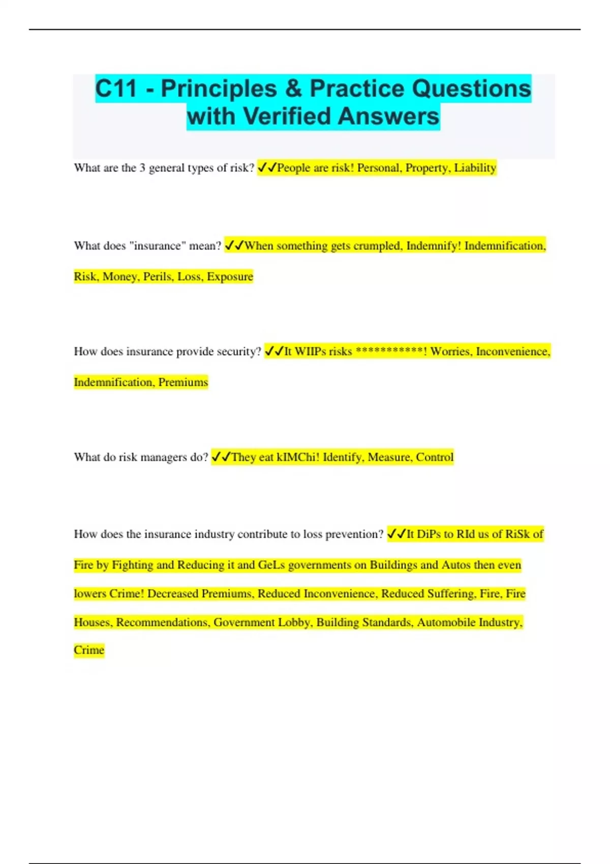 C11 - Principles & Practice Questions with Verified Answers What are the 3 general types of risk? People are risk! Personal, Property, Liability What does "insurance" mean? When something gets crumpled, Indemnify! Indemnification, Risk, Money, Perils, Loss, Exposure How does insurance provide security? It WIIPs risks ***********! Worries, Inconvenience, Indemnification, Premiums What do risk managers do? They eat kIMChi! Identify, Measure, Control How does the insurance industry contribute to loss prevention? It DiPs to RId us of RiSk of Fire by Fighting and Reducing it and GeLs governments on Buildings and Autos then even lowers Crime! Decreased Premiums, Reduced Inconvenience, Reduced Suffering, Fire, Fire Houses, Recommendations, Government Lobby, Building Standards, Automobile Industry, Crime As an adjuster, what do you think people need to know to understand the benefits of insurance? It provides SECurity and exCITes Job creation and Loss Prevention! Security, Easy payments, Credit, Capital, Investment, Taxes, Jobs, Loss Prevention Define "Rate." 1. -ppu/yr of insurance 2. -either as a percentage or monetary value Define "Premium." 1. -total cost of an insurance policy 2. -calculated as "rate" X "amount insured" Define "Law of large numbers." 1.-principle that certainty of probability increases with an increase of statistical data 2. It's used to determine premiums 3. and also know as the law of averages. Define "Theory of probability." 1. -theory that historical data can be used to determine future probability 2. It's expressed as a ratio of actual/possible occurrences. What is chance and its relationship to insurance? With it, we can FuND the CaP! Fraction, Numerator, Denominator, Chance definition, Probability What are the three main factors to ratemaking? CRuST! Conditions Relative, Size, Time Period Describe "Ratemaking" as a process. Come THe & Gather a FAST 2 PPs for the fIREPOT Rate! 1. Classify risk by Type and Hazards 2. Gather statistics to determine Frequency & Average by considering Size and Time Period. 3. 2PPs - determine pure Premium 4. determine total Premium by loading with Inflation, Repair Costs, Expenses, Profit, Overhead, Trends 5. determine Rate Describe "Underwriting" as a process. RESTARRT the AMPErE CoCoAS! 1. Receive the request. 2. Examine and Select the risks by considering the Applicant, Moral hazard, Physical hazard, risk Exposure, amount of Exposure. 3. possibly ask for Technical support to rate and/or recommend. 4. Assess the risk to either improve safety or adjust premium. 5. Reject the risk due to Class, Certainty of loss, Applicant, Sub-standards. 6. ReTain a certain amount of the risk. What does OSFI stand for? Office of the Superintendent of Financial Institutions Concerning insurance companies, what is the mandate of the OSFI? RuFFEIE P! Regulate Federally chartered insurance companies Regulate Foreign insurance companies Ensure Inadequately funded insurance companies are not established Ensure Existing companies remain