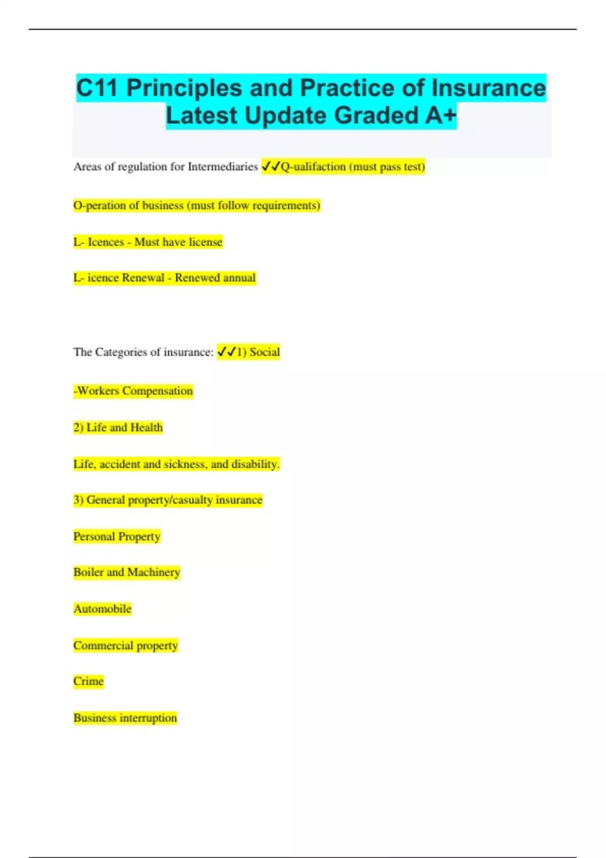C11 Principles and Practice of Insurance Latest Update Graded A+ Areas of regulation for Intermediaries Q-ualifaction (must pass test) O-peration of business (must follow requirements) L- Icences - Must have license L- icence Renewal - Renewed annual The Categories of insurance: 1) Social -Workers Compensation 2) Life and Health Life, accident and sickness, and disability. 3) General property/casualty insurance Personal Property Boiler and Machinery Automobile Commercial property Crime Business interruption Liability Aviation Marine Inland Transport Main functions of insurance 1.) Spread of risk - volume, diversity of risk, location 2.) Security - Peace of mind 3.) Credit - Individuals, banks 4.) Capital - Premium investments 5.) Employment - Insurance creates jobs 6.) Loss prevention - Research Reasons of reinsuring: 1.) Increase the insurer's capacity to write business 2.) Maintain a proper reserve 3.) Reduce the effect of a catastrophic loss 4.) Provide stability in a fluctuating market 5.) Enable an insurer to cease operations Steps of Rate Determination 1.) Classification of risks - Broad categories work way down 2.) Gather statistics - Better for longer period 3.) Determine the pure premium - Required to pay the losses that occur 4.) Determine Total premium Pure premium + trendsand expense 5.) Determine rate per 100$ Things required for insurance contracts 1.) Insurable interest 2.) A risk of promise and indemnity 3.) Utmost good faith Risk Management steps: Identify: You would have to identify the risks. Measure: Once you have found which risks pose a threat you need to measure the loss frequency and severity. Control: The three ways of controlling risk are: Reduce Assume