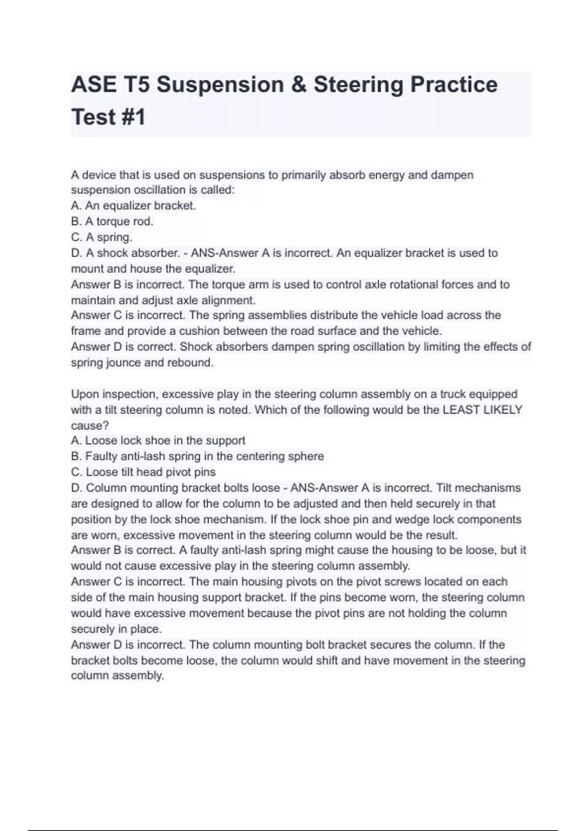ASE T5 Suspension & Steering Practice Test #1 with complete solution