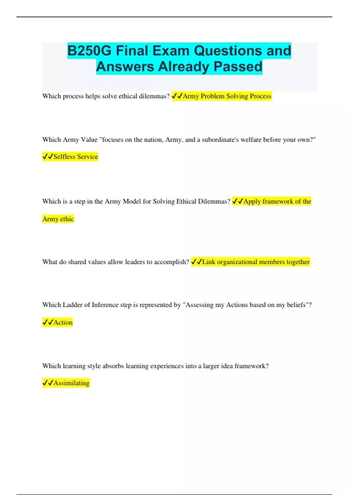 B250G Final Exam Questions and Answers Already Passed Which process helps solve ethical dilemmas? Army Problem Solving Process Which Army Value "focuses on the nation, Army, and a subordinate's welfare before your own?" Selfless Service Which is a step in the Army Model for Solving Ethical Dilemmas? Apply framework of the Army ethic What do shared values allow leaders to accomplish? Link organizational members together Which Ladder of Inference step is represented by "Assessing my Actions based on my beliefs"? Action Which learning style absorbs learning experiences into a larger idea framework? Assimilating What are the Elements of Thought used for? not Solve a problem Which learning mode employs abstract conceptualization? Thinking Which step in the Army Problem Solving Process uses brainstorming? Generate possible solutions Which step in the Army Problem Solving Process assists in evaluating possible solutions to a problem? Develop Criteria Which intellectual trait includes conscious understanding of knowledge limits, biases, prejudices, and viewpoint limitations? Intellectual Humility Which Values in Action (VIA) Character strength covers industry, diligence, and perseverance? Courage Which intellectual trait includes the need to fairly address ideas, beliefs, or viewpoints toward which you have strong negative emotions? Intellectual Courage Which conflict mode occurs between individuals? Interpersonal Which conflict resolution mode is appropriate when more information is required? Avoiding Which are two conflict situation behavioral dimensions? Assertive and Cooperative How do leaders maintain team cohesiveness and momentum when dealing with issues? Swiftly In the Adjournment stage, which Tuckman