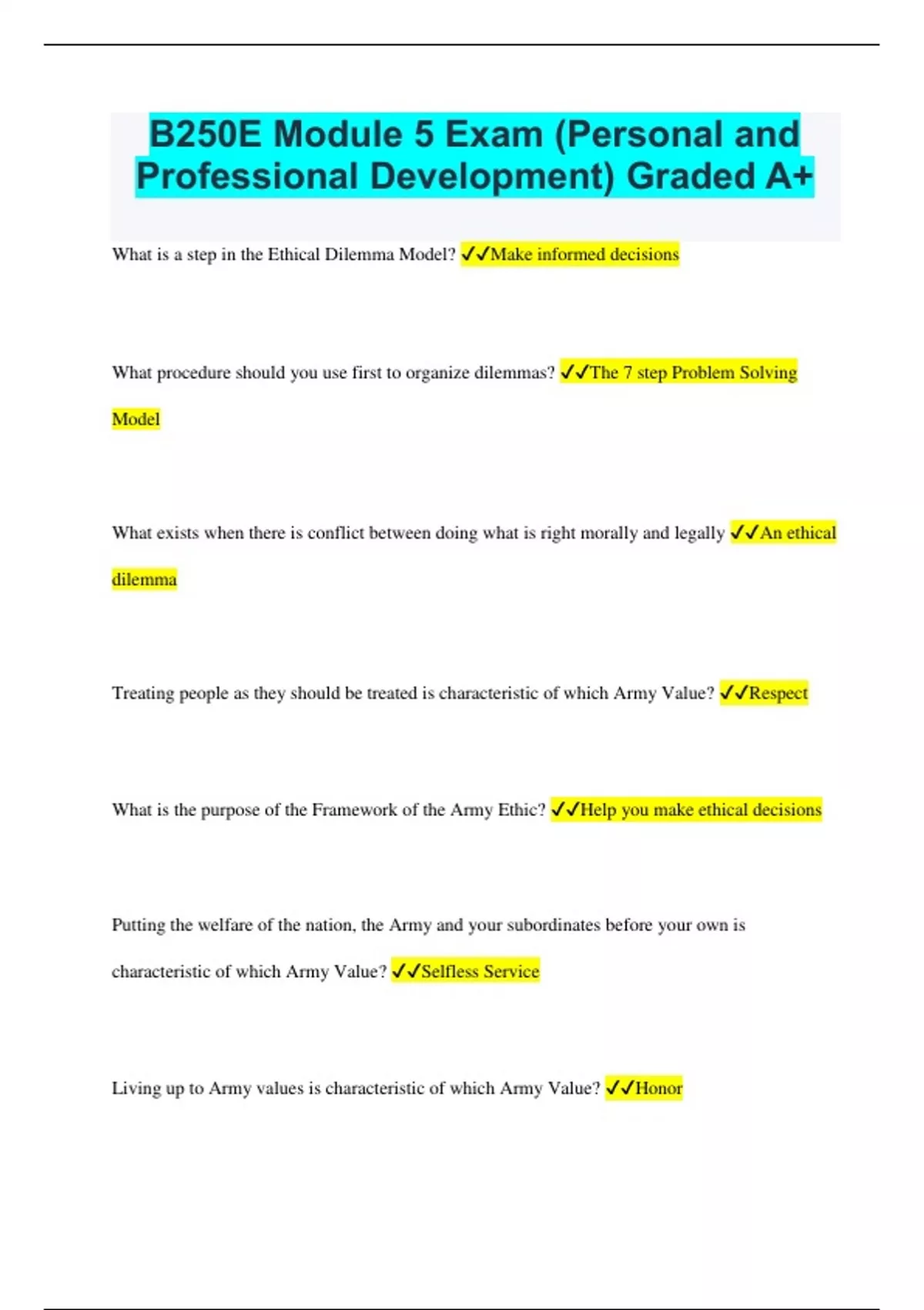 B250E Module 5 Exam (Personal and Professional Development) Graded A+ What is a step in the Ethical Dilemma Model? Make informed decisions What procedure should you use first to organize dilemmas? The 7 step Problem Solving Model What exists when there is conflict between doing what is right morally and legally An ethical dilemma Treating people as they should be treated is characteristic of which Army Value? Respect What is the purpose of the Framework of the Army Ethic? Help you make ethical decisions Putting the welfare of the nation, the Army and your subordinates before your own is characteristic of which Army Value? Selfless Service Living up to Army values is characteristic of which Army Value? Honor . The framework of the Army Ethic is divided in to what Foundations? Legal and Moral Fulfilling your obligations is characteristic of which Army Value? Duty . What Army Value requires you to fulfill your obligations? Duty Bearing true faith and allegiance to the U.S. Constitution, the Army, your unit and other Soldiers is characteristic of which Army Value? Loyalty
