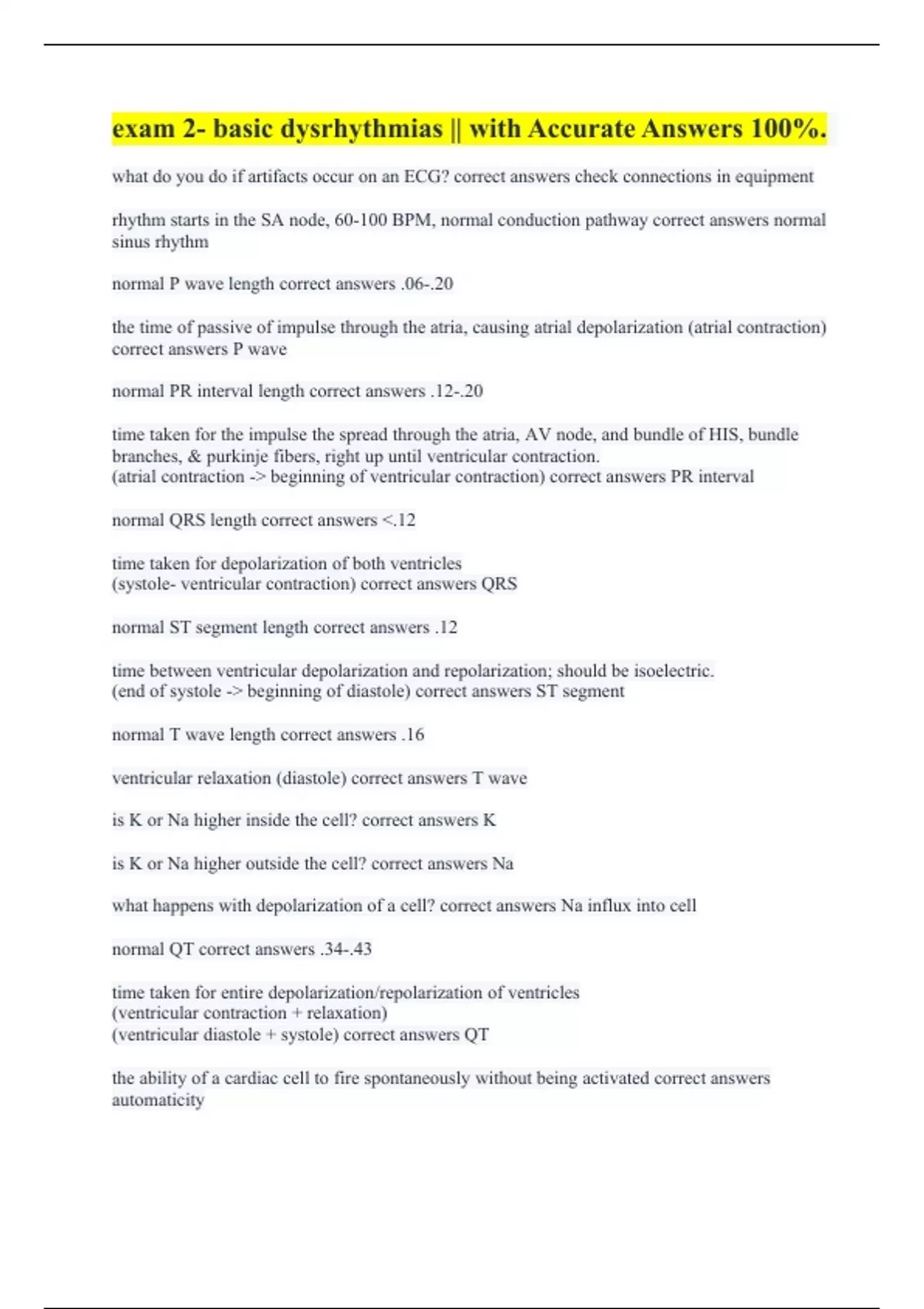 what do you do if artifacts occur on an ECG? correct answers check connections in equipment rhythm starts in the SA node, 60-100 BPM, normal conduction pathway correct answers normal sinus rhythm normal P wave length correct answers .06-.20 the time of passive of impulse through the atria, causing atrial depolarization (atrial contraction) correct answers P wave normal PR interval length correct answers .12-.20 time taken for the impulse the spread through the atria, AV node, and bundle of HIS, bundle branches, & purkinje fibers, right up until ventricular contraction. (atrial contraction -> beginning of ventricular contraction) correct answers PR interval normal QRS length correct answers <.12 time taken for depolarization of both ventricles (systole- ventricular contraction) correct answers QRS normal ST segment length correct answers .12 time between ventricular depolarization and repolarization; should be isoelectric. (end of systole -> beginning of diastole) correct answers ST segment normal T wave length correct answers .16 ventricular relaxation (diastole) correct answers T wave is K or Na higher inside the cell? correct answers K is K or Na higher outside the cell? correct answers Na what happens with depolarization of a cell? correct answers Na influx into cell normal QT correct answers .34-.43 time taken for entire depolarization/repolarization of ventricles (ventricular contraction + relaxation) (ventricular diastole + systole) correct answers QT the ability of a cardiac cell to fire spontaneously without being activated correct answers automaticity