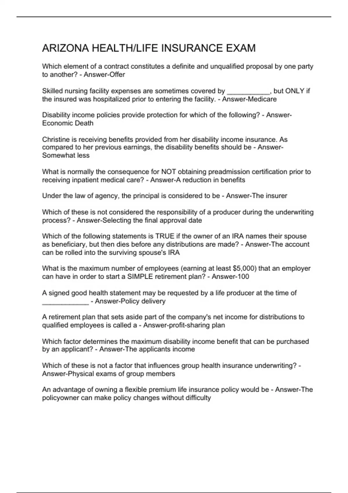 Which element of a contract constitutes a definite and unqualified proposal by one party to another? - Answer-Offer Skilled nursing facility expenses are sometimes covered by ___________, but ONLY if the insured was hospitalized prior to entering the facility. - Answer-Medicare Disability income policies provide protection for which of the following? - Answer-Economic Death Christine is receiving benefits provided from her disability income insurance. As compared to her previous earnings, the disability benefits should be - Answer-Somewhat less What is normally the consequence for NOT obtaining preadmission certification prior to receiving inpatient medical care? - Answer-A reduction in benefits Under the law of agency, the principal is considered to be - Answer-The insurer Which of these is not considered the responsibility of a producer during the underwriting