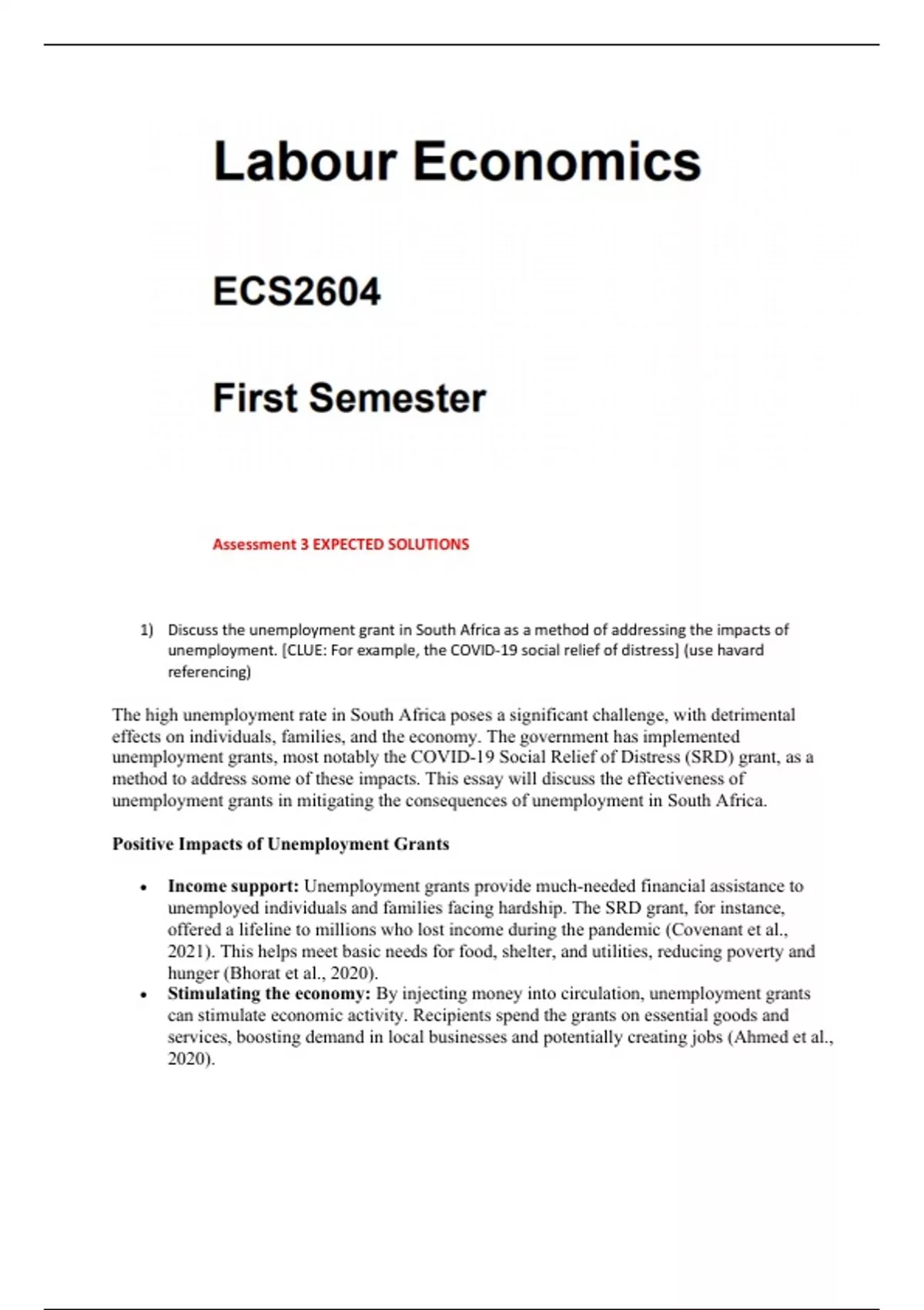 1) Discuss the unemployment grant in South Africa as a method of addressing the impacts of