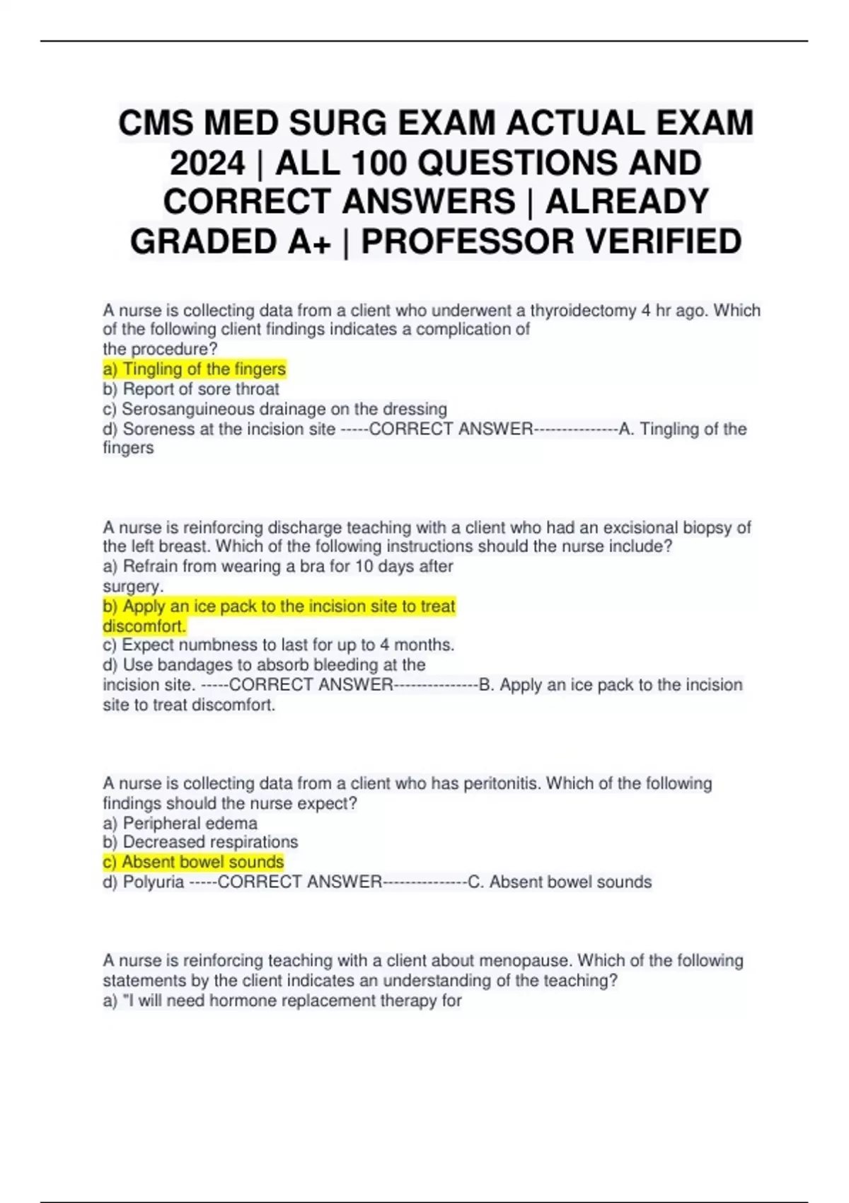 CMS MED SURG EXAM ACTUAL EXAM 2024 | ALL 100 QUESTIONS AND CORRECT ANSWERS | ALREADY GRADED A+ | PROFESSOR VERIFIED
