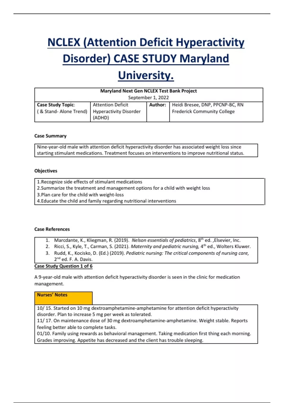 NCLEX (Attention Deficit Hyperactivity Disorder) CASE STUDY Maryland University.