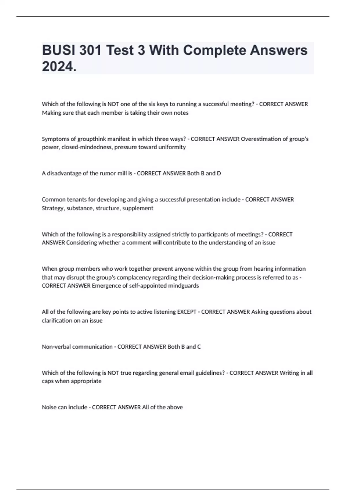 BUSI 301 Test 3 With Complete Answers 2024. Which of the following is NOT one of the six keys to running a successful meeting? - CORRECT ANSWER Making sure that each member is taking their own notes Symptoms of groupthink manifest in which three ways? - CORRECT ANSWER Overestimation of group's power, closed-mindedness, pressure toward uniformity A disadvantage of the rumor mill is - CORRECT ANSWER Both B and D Common tenants for developing and giving a successful presentation include - CORRECT ANSWER Strategy, substance, structure, supplement Which of the following is a responsibility assigned strictly to participants of meetings? - CORRECT ANSWER Considering whether a comment will contribute to the understanding of an issue When group members who work together prevent anyone within the group from hearing information that may disrupt the group's complacency regarding their decision-making process is referred to as - CORRECT ANSWER Emergence of self-appointed mindguards All of the following are key points to active listening EXCEPT - CORRECT ANSWER Asking questions about clarification on an issue Non-verbal communication - CORRECT ANSWER Both B and C Which of the following is NOT true regarding general email guidelines? - CORRECT ANSWER Writing in all caps when appropriate Noise can include - CORRECT ANSWER All of the above
