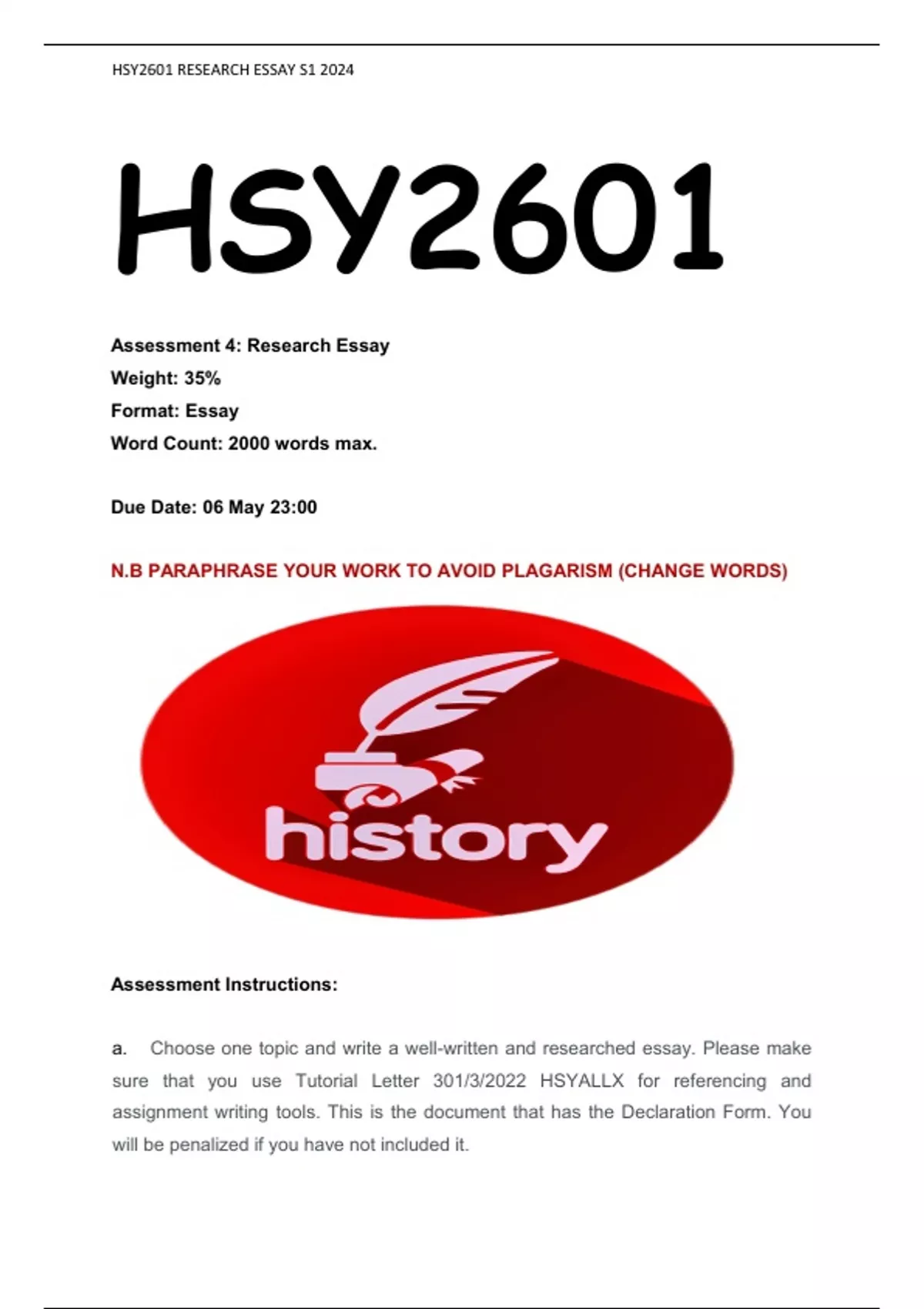 HSY2601 RESEARCH ESSAY S1 2024