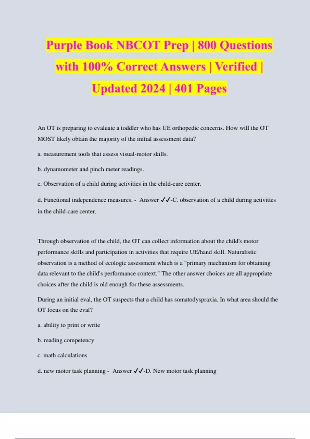 Purple Book NBCOT Prep | 800 Questions with 100% Correct Answers | Verified | Updated 2024 | 401 Pages