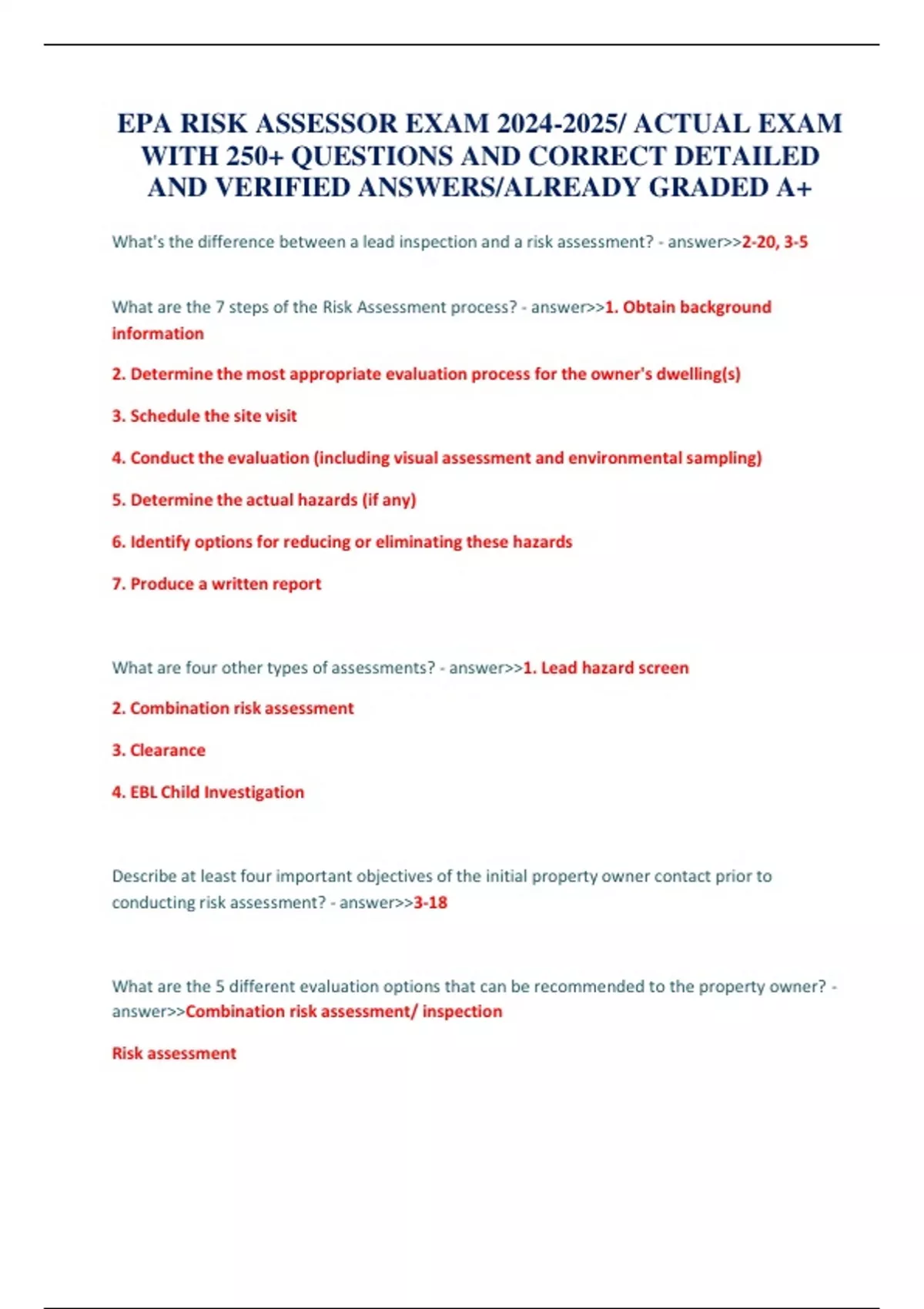 EPA RISK ASSESSOR EXAM / ACTUAL EXAM WITH 250+ QUESTIONS AND CORRECT DETAILED AND VERIFIED ANSWERS/ALREADY GRADED A+