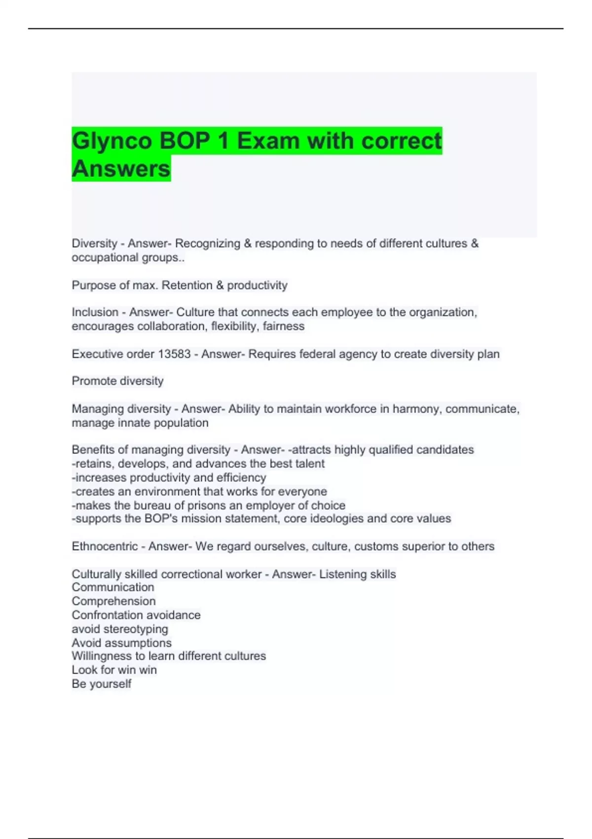 glynco bop 1 exam with correct answers