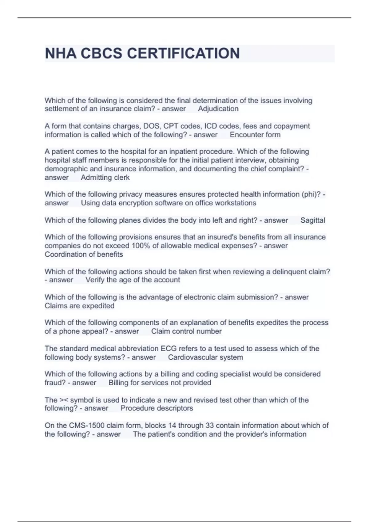 NHA CBCS CERTIFICATION QUESTIONS AND ANSWERS 2024