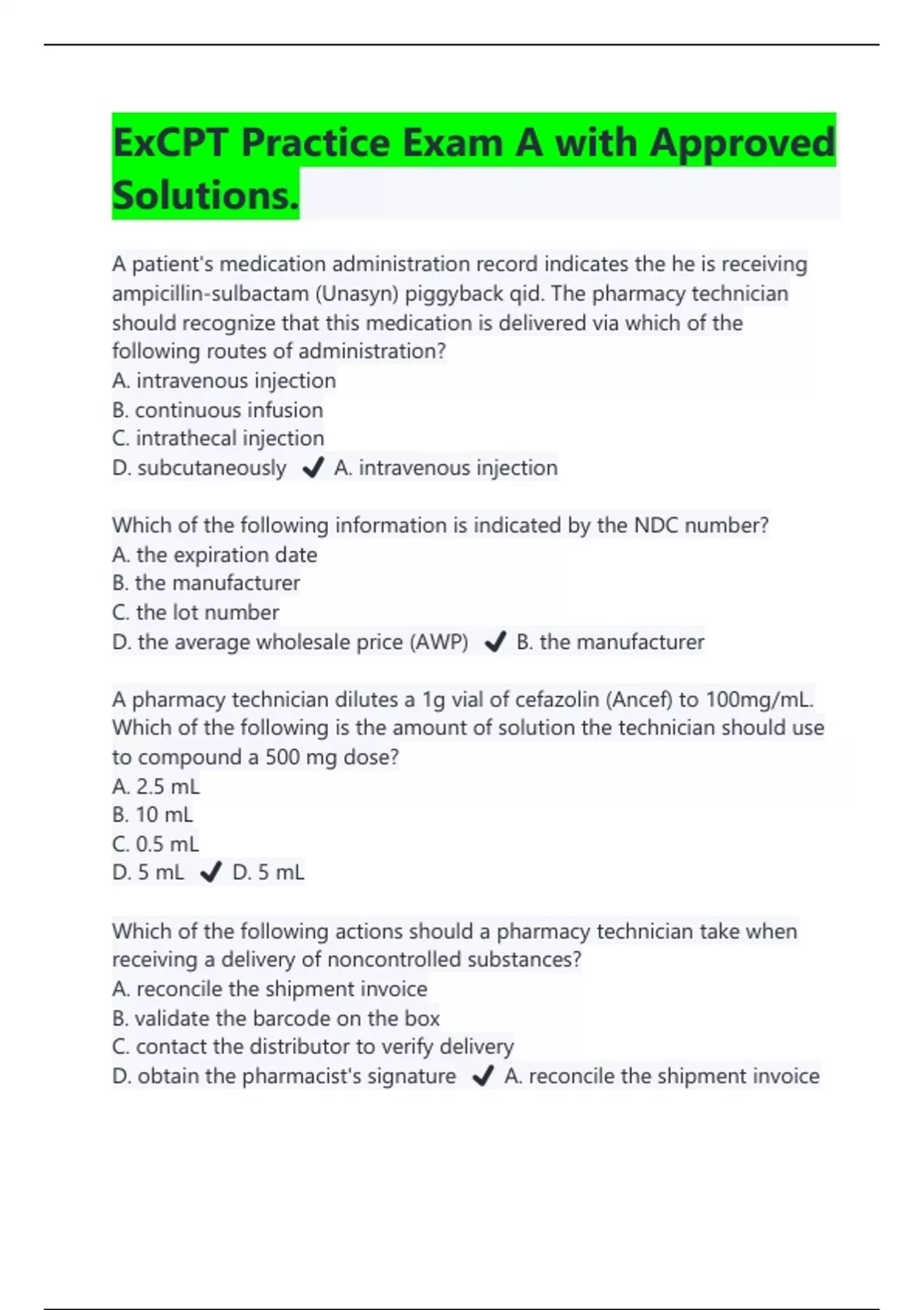 ExCPT Practice Exam A with Approved Solutions |Latest 2024/2025 A patient's medication administration record indicates the he is receiving ampicillin-sulbactam (Unasyn) piggyback qid. The pharmacy technician should recognize that this medication is delivered via which of the following routes of administration? A. intravenous injection B. continuous infusion C. intrathecal injection D. subcutaneously ️ A. intravenous injection Which of the following information is indicated by the NDC number? A. the expiration date B. the manufacturer C. the lot number D. the average wholesale price (AWP) ️ B. the manufacturer A pharmacy technician dilutes a 1g vial of cefazolin (Ancef) to 100mg/mL. Which of the following is the amount of solution the technician should use to compound a 500 mg dose? A. 2.5 mL B. 10 mL C. 0.5 mL D. 5 mL ️ D. 5 mL Which of the following actions should a pharmacy technician take when receiving a delivery of noncontrolled substances? A. reconcile the shipment invoice B. validate the barcode on the box C. contact the distributor to verify delivery D. obtain the pharmacist's signature ️ A. reconcile the shipment invoice