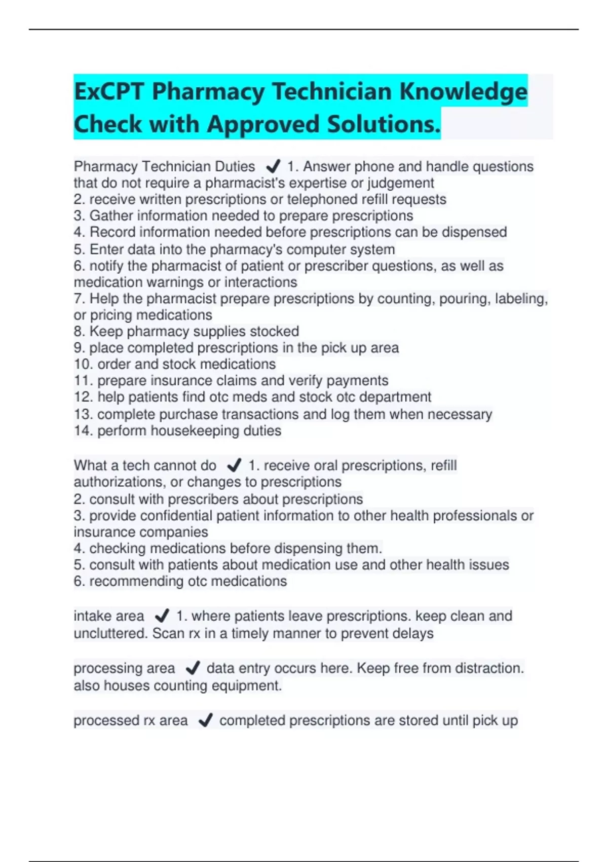 ExCPT Pharmacy Technician Knowledge Check with Approved Solutions | Latest 2024/2025 Pharmacy Technician Duties ️ 1. Answer phone and handle questions that do not require a pharmacist's expertise or judgement 2. receive written prescriptions or telephoned refill requests 3. Gather information needed to prepare prescriptions 4. Record information needed before prescriptions can be dispensed 5. Enter data into the pharmacy's computer system 6. notify the pharmacist of patient or prescriber questions, as well as medication warnings or interactions 7. Help the pharmacist prepare prescriptions by counting, pouring, labeling, or pricing medications 8. Keep pharmacy supplies stocked 9. place completed prescriptions in the pick up area 10. order and stock medications 11. prepare insurance claims and verify payments 12. help patients find otc meds and stock otc department 13. complete purchase transactions and log them when necessary 14. perform housekeeping duties What a tech cannot do ️ 1. receive oral prescriptions, refill authorizations, or changes to prescriptions 2. consult with prescribers about prescriptions 3. provide confidential patient information to other health professionals or insurance companies 4. checking medications before dispensing them. 5. consult with patients about medication use and other health issues 6. recommending otc medications intake area ️ 1. where patients leave prescriptions. keep clean and uncluttered. Scan rx in a timely manner to prevent delays processing area ️ data entry occurs here. Keep free from distraction. also houses counting equipment. processed rx area ️ completed prescriptions are stored until pick up out window- ️ where patients pick up completed prescriptions. cash register is used. nearby counseling area. other areas ️ administration area, clean room for sterile compounding, otc area, and consultation room