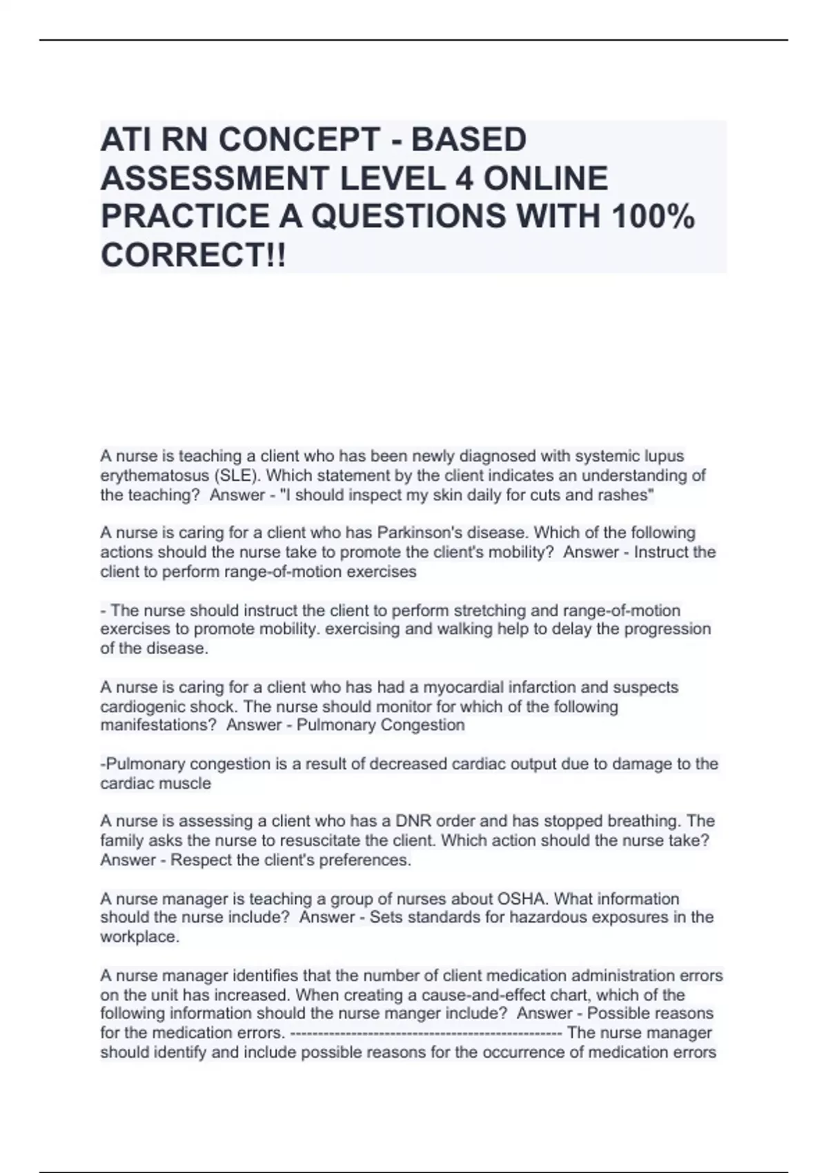 ATI RN CONCEPT - BASED ASSESSMENT LEVEL 4 ONLINE PRACTICE A QUESTIONS WITH 100% CORRECT!!