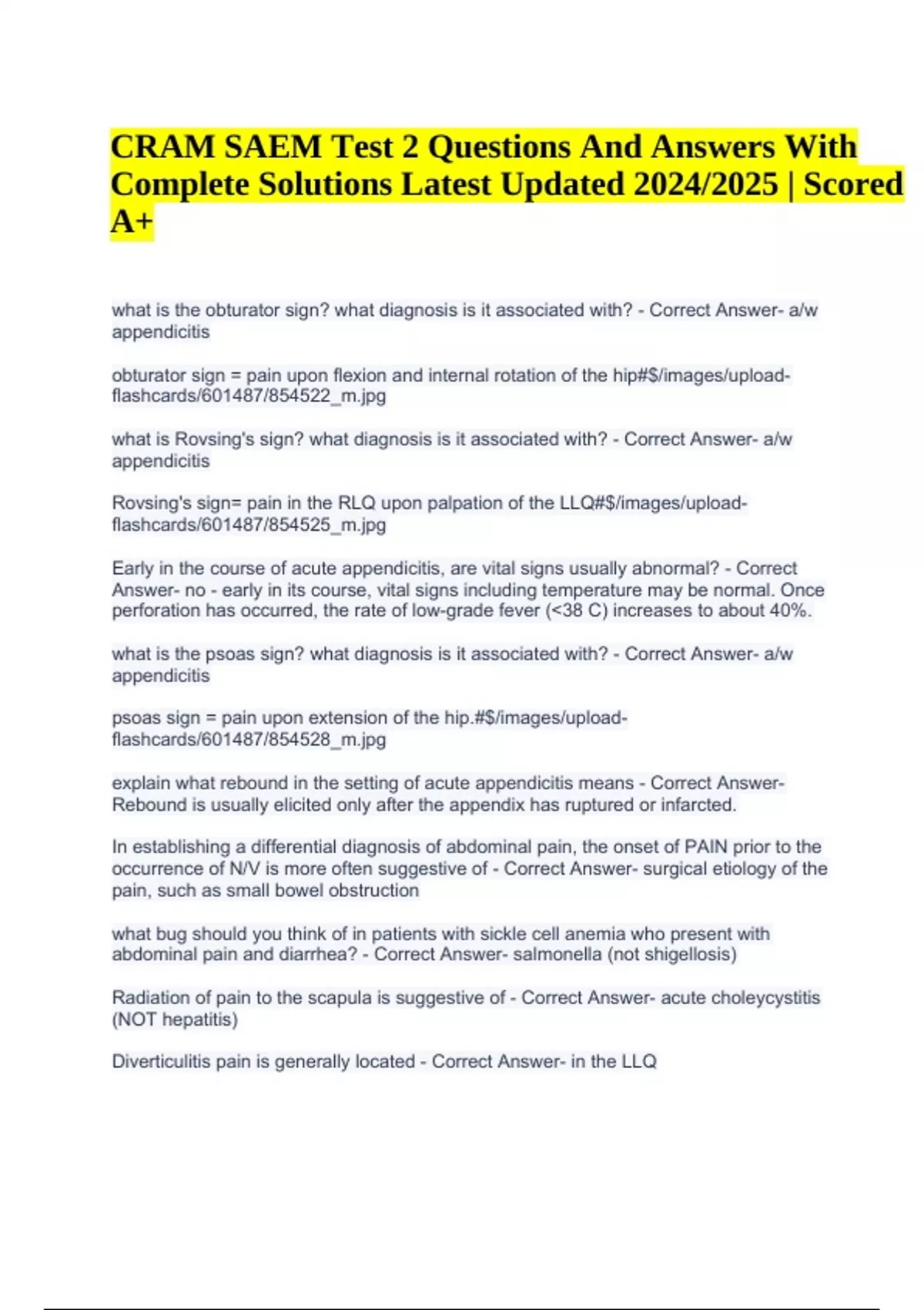 CRAM SAEM Test 2 Questions And Answers With Complete Solutions Latest Updated 2024/2025 | Scored A+. what is the obturator sign? what diagnosis is it associated with? - Correct Answer- a/w appendicitis obturator sign = pain upon flexion and internal rotation of the hip#$/images/uploadflashcards/601487/854522_ what is Rovsing's sign? what diagnosis is it associated with? - Correct Answer- a/w appendicitis Rovsing's sign= pain in the RLQ upon palpation of the LLQ#$/images/uploadflashcards/601487/854525_ Early in the course of acute appendicitis, are vital signs usually abnormal? - Correct Answer- no - early in its course, vital signs including temperature may be normal. Once perforation has occurred, the rate of low-grade fever (<38 C) increases to about 40%. what is the psoas sign? what diagnosis is it associated with? - Correct Answer- a/w appendicitis psoas sign = pain upon extension of the hip.#$/images/uploadflashcards/601487/854528_ explain what rebound in the setting of acute appendicitis means - Correct AnswerRebound is usually elicited only after the appendix has ruptured or infarcted. In establishing a differential diagnosis of abdominal pain, the onset of PAIN prior to the occurrence of N/V is more often suggestive of - Correct Answer- surgical etiology of the pain, such as small bowel obstruction what bug should you think of in patients with sickle cell anemia who present with abdominal pain and diarrhea? - Correct Answer- salmonella (not shigellosis) Radiation of pain to the scapula is suggestive of - Correct Answer- acute choleycystitis (NOT hepatitis) Diverticulitis pain is generally located - Correct Answer- in the LLQ CRAM SAEM Test 2 Questions And Answers With Complete Solutions Latest Updated 2024/2025 | Scored A+ Describe the pain patterns a/w with peptic ulcer disease (PUD) - Correct Answer- pain that is worse preceding a meal non-radiating, burning epigastric pain pain that awakens a patient in the middle of the night relief of abdominal pain with antacids note: unrelenting pain over a period of weeks should suggest an alternative diagnosis A 78 year old female presents to the E.D. with a sensation of LLQ abdominal pain, accompanied by some irregular bowel movements and loss of appetite. Her abdominal CT (two images) is shown in the Figure. What is the most likely diagnosis? - Correct Answer- /images/upload-flashcards/601487/854531_#$A patient with this general picture is most likely to have diverticulitis, which is revealed on the CT scan as diverticular disease with inflammation (wall thickening and stranding).#$/images/uploadflashcards/601487/854534_ A mother brings her 6 week old boy to the emergency room. She states the baby has been vomiting everything she's tried to feed him for the past 12 hours. She states that he usually eats readily and completes an entire feeding, but he is unable to keep anything down. The emesis is non-bloody and non-bilious, however it is projectile in nature. What is the most likely condition in this patient? - Correct Answer- pyloric stenosis The answer is C. Hypertrophic pyloric stenosis typically presents in the second to sixth week of life and is four times more common in males than females. Infants with hypertrophic pyloric stenosis typically are vigorous eaters but shortly afterward regurgitate the entire feeding contents in a projectile fashion. The emesis is non-bilious. The classic finding on exam is an "olive" palpable in the abdomen, and diagnosis is typically via ultrasound. Intussusception typically presents between the ages of 5 and 12 months. Gastroenteritis is characterized by diarrhea as well as vomiting. Neither constipation nor appendicitis typically present with protracted vomiting, though the latter condition tends to present atypically in young children (and elderly adults). 46yo F c/o abrupt onset of intermittent severe pain in L flank & abdomen that woke her from sleep. She is pacing & appears extremely uncomfortable. She has never experienced this type of pain previously and denies fevers or other symptoms. Renal calculus is suspected. Some questions - What is the best diagnostic test (KUB, IVP, Helical CT, U/S)? How helpful is a Urinalysis? - Correct Answer- Helical CT scan is greater than 95% sensitive and specific for renal calculi Helical CT scan has been shown to be both highly sensitive and specific in the diagnosis of renal calculi. It is the preferred modality for evaluation in many centers. Although urinalysis typically demonstrates hematuria in patients with renal calculi, hematuria is not specific enough to confirm the diagnosis, and imaging is warranted in all first-time presenters. KUB detects approximately 60-70% of calculi (though studies addressing this issue are somewhat methodologically flawed). Ultrasound is not reliable for detecting small calculi, but is 85-94% sensitive and 100% specific at demonstrating hydronephrosis. IVP is contraindicated in patients with renal insufficiency due to the dye load necessary to perform the study. 50 yo M p/w 1 day of gradually worsening, intermittent, LLQ pain a/w loose stools. No fevers or bloody bowel movements. Similar sxs in the past were self-limited. Vital signs wnl. PE shows mild tenderness in LLQ, +BS and no masses or peritoneal signs. His PCP can see him tomorrow in his clinic. What should be done next in the E.D.? - Correct Answer- Discharge home on high-fiber diet, laxatives and stool softeners This patient has classic diverticulosis (saclike protrusions of colonic mucosa through the muscularis) without signs of acute diverticulitis (inflammation of diverticula). Usually these patients can be managed as outpatients with a high-fiber diet and treatments to decrease intestinal spasm. If the patient develops fever or pain increases he may need further evaluation to rule out abscess formation. Diverticulitis is treated with antibiotics, bowel rest and analgesics. You are treating a 25yoM with the recent diagnosis of Crohn's disease in the ED. Regard