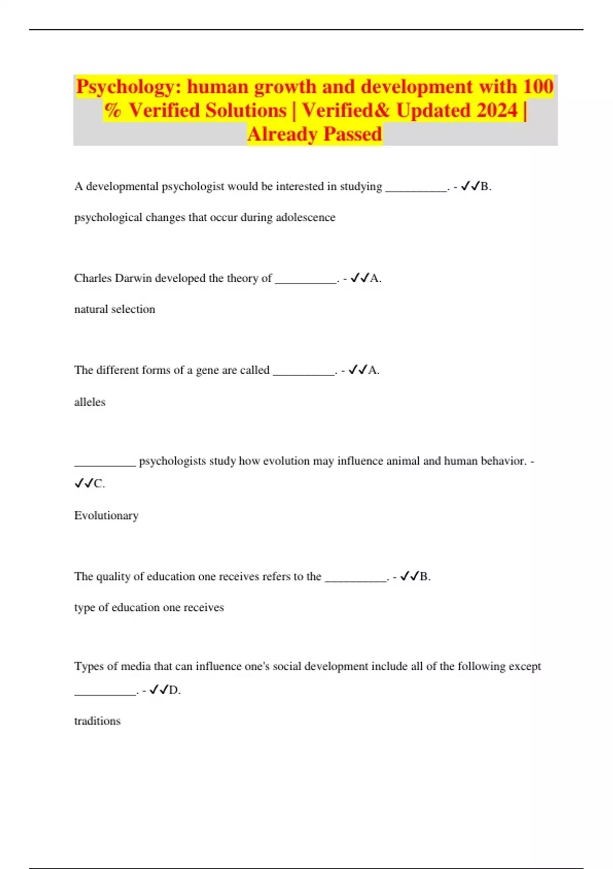 Psychology: human growth and development with 100 % Verified Solutions | Verified& Updated 2024 | Already Passed A developmental psychologist would be interested in studying __________. - B. psychological changes that occur during adolescence Charles Darwin developed the theory of __________. - A. natural selection The different forms of a gene are called __________. - A. alleles __________ psychologists study how evolution may influence animal and human behavior. - C. Evolutionary The quality of education one receives refers to the __________. - B. type of education one receives Types of media that can influence one's social development include all of the following except __________. - D. traditions All of the following are environmental influences except ____________. - B. genes Nature refers to __________, while nurture refers to __________. - B. heredity . . . environment The ability of an individual to survive and reproduce refers to __________. - C. fitness If the ability to roll one's tongue is dominant (R) and the inability to roll one's tongue is recessive (r), what are the possible genotypes for someone who can roll their tongue? - RR and Rr Which of the following statements is not true about genes? - A. Genes consist of hormones that regulate bodily functions. What does Charles Darwin's theory of natural selection state about traits? - Traits that provide a survival or reproductive advantage are more likely to be passed on to future generations. Environmental influences begin at birth and continue throughout life. - false __________ refers to the ability of an individual to survive and reproduce, whereas __________ is any inherited characteristic that increases one's chance of survival. - C. Fitness . . . adaptation Which of the following best explains how music influences behavior? - B. Music can not be blamed for violent behavior. Developmental psychology is the field that primarily studies how humans grow and develop. - TRUE Researchers use all of the following to study the impact of heredity on behavior except __________ studies. - peers Which theorist conducted an experiment in which a rat was conditioned to press a bar in order to receive a reward, illustrating how nurture influences behavior? - D. B. F. Skinner The Human Genome Project was an international project aimed at mapping and sequencing all of the genes in human DNA. - TRUE People from the same family share the same genetic code. - False