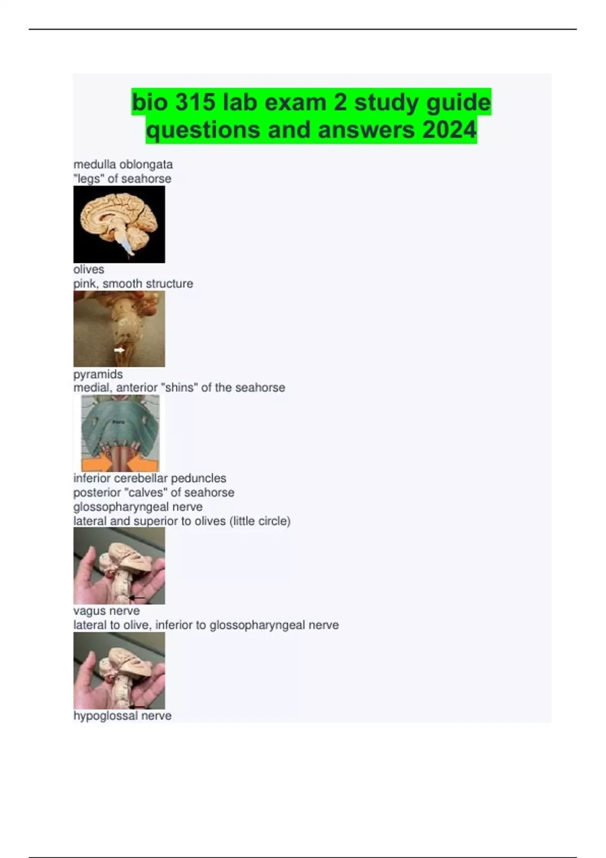 medulla oblongata "legs" of seahorse olives pink, smooth structure pyramids medial, anterior "shins" of the seahorse inferior cerebellar peduncles posterior "calves" of seahorse glossopharyngeal nerve lateral and superior to olives (little circle) vagus nerve lateral to olive, inferior to glossopharyngeal nerve hypoglossal nerve longer (hotdog bun), medial to olive spinal accessory nerve 2 v-shapes on sides of "legs" Pons "belly" of the seahorse middle cerebellar peduncles circular flat portion on side of pons superior cerebellar peduncles posterior archway (9) fourth ventricle "triangle" seen inside brain rhomboid fossa depression on the anterior side of the "triangle" cerebellar part of the 4th ventricle posterior superior portion of the "triangle" abducens nerve lines on pons (abs) facial nerve medial line lateral to abducens nerve vestibulocochlear nerve two lines lateral to facial nerve trigeminal nerve snowman shape on lateral side of pons midbrain neck on seahorse corpora quadrigemina posterior butterfly (collective structure) superior colliculi top "wings" of corpora quadrigemina inferior colliculi bottom "wings" of corpora quadrigemina substantia nigra dark lines seen on the brain steak associated with Parkinson's disease cerebral aqueduct hole seen on other side of steak oculomotor nerve internal "necklace" (choker) trochlear nerve external "necklace" Diencephalon head/hat thalamus brain/eye of seahorse