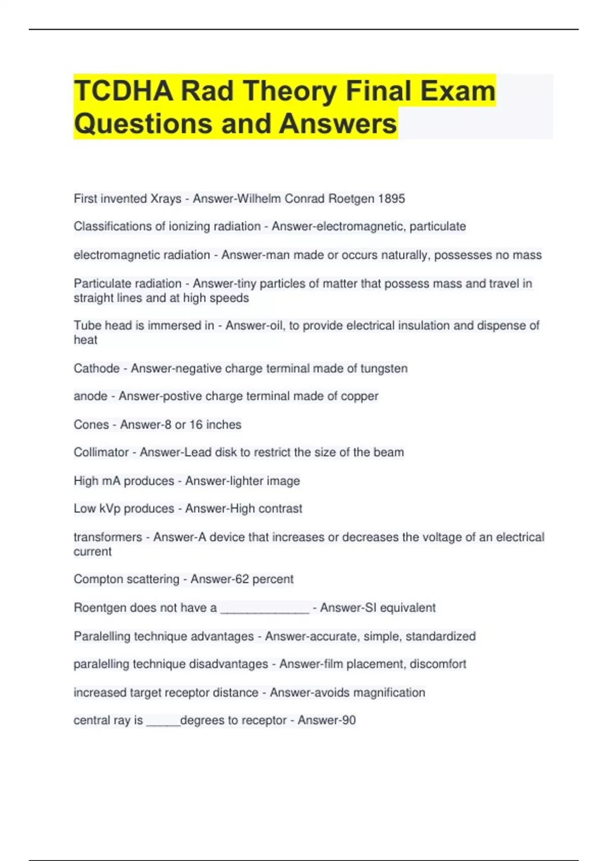 TCDHA Rad Theory Final Exam Questions and Answers First invented Xrays - Answer-Wilhelm Conrad Roetgen 1895 Classifications of ionizing radiation - Answer-electromagnetic, particulate electromagnetic radiation - Answer-man made or occurs naturally, possesses no mass Particulate radiation - Answer-tiny particles of matter that possess mass and travel in straight lines and at high speeds Tube head is immersed in - Answer-oil, to provide electrical insulation and dispense of heat Cathode - Answer-negative charge terminal made of tungsten anode - Answer-postive charge terminal made of copper Cones - Answer-8 or 16 inches Collimator - Answer-Lead disk to restrict the size of the beam High mA produces - Answer-lighter image Low kVp produces - Answer-High contrast transformers - Answer-A device that increases or decreases the voltage of an electrical current Compton scattering - Answer-62 percent Roentgen does not have a _____________ - Answer-SI equivalent Paralelling technique advantages - Answer-accurate, simple, standardized paralelling technique disadvantages - Answer-film placement, discomfort increased target receptor distance - Answer-avoids magnification central ray is _____degrees to receptor - Answer-90 if the lack of parallelism is _______ the image is acceptable - Answer-less than 20 central ray is _______degrees to tooth surface - Answer-+10 Radiolucent - Answer-appears dark radiopaque - Answer-appears light airspace - Answer-black space between teeth Xray film layers - Answer-film base, adhesive layer, film emulsion, protective layer what is the thickest layer of xray film? - Answer-base components of film emulsion - Answer-gelatin and silver halide crystals latent image - Answer-remains invisible until the film is processed extraoral films - Answer-panoramic and cephalometric types of dental x-ray film - Answer-Intraoral Extraoral Duplicating