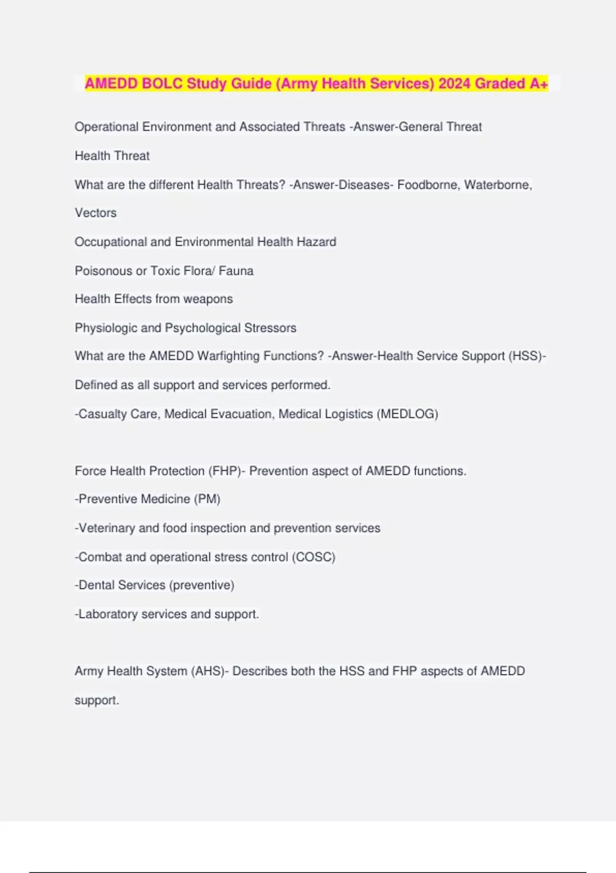 AMEDD BOLC Study Guide (Army Health Services) 2024 Graded A+ Operational Environment and Associated Threats -Answer-General Threat Health Threat What are the different Health Threats? -Answer-Diseases- Foodborne, Waterborne, Vectors Occupational and Environmental Health Hazard Poisonous or Toxic Flora/ Fauna Health Effects from weapons Physiologic and Psychological Stressors What are the AMEDD Warfighting Functions? -Answer-Health Service Support (HSS)- Defined as all support and services performed. -Casualty Care, Medical Evacuation, Medical Logistics (MEDLOG) Force Health Protection (FHP)- Prevention aspect of AMEDD functions. -Preventive Medicine (PM) -Veterinary and food inspection and prevention services -Combat and operational stress control (COSC) -Dental Services (preventive) -Laboratory services and support. Army Health System (AHS)- Describes both the HSS and FHP aspects of AMEDD support. What are the stages of Tactical Combat Casualty Care? (TC3) -Answer-Care Under Fire Tactical Field Care Tactical Evacuation Care What are the principles of the Army Health System? -Answer-(CCCPFM) Conformity Continuity Control Proximity Flexibility Mobility How many roles of Medical Care are there?