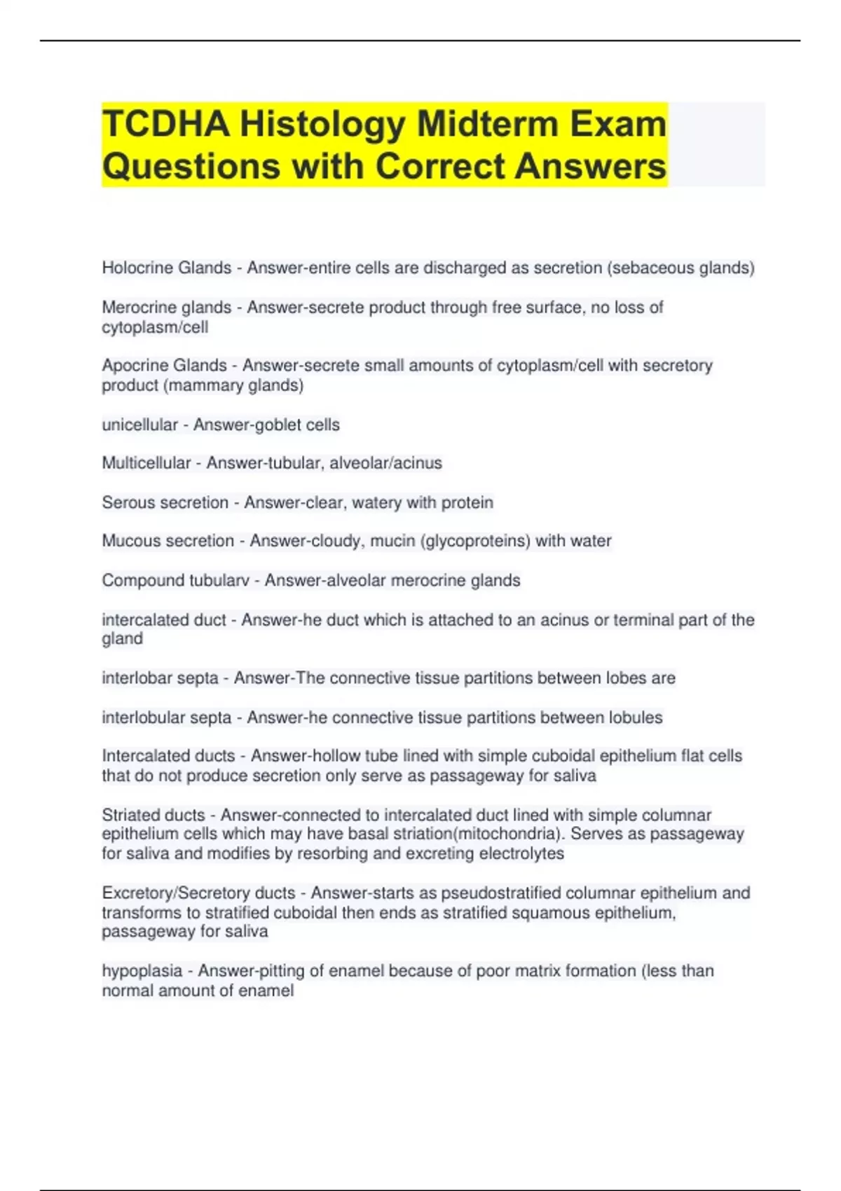 TCDHA Histology Midterm Exam Questions with Correct Answers Holocrine Glands - Answer-entire cells are discharged as secretion (sebaceous glands) Merocrine glands - Answer-secrete product through free surface, no loss of cytoplasm/cell Apocrine Glands - Answer-secrete small amounts of cytoplasm/cell with secretory product (mammary glands) unicellular - Answer-goblet cells Multicellular - Answer-tubular, alveolar/acinus Serous secretion - Answer-clear, watery with protein Mucous secretion - Answer-cloudy, mucin (glycoproteins) with water Compound tubularv - Answer-alveolar merocrine glands intercalated duct - Answer-he duct which is attached to an acinus or terminal part of the gland interlobar septa - Answer-The connective tissue partitions between lobes are interlobular septa - Answer-he connective tissue partitions between lobules Intercalated ducts - Answer-hollow tube lined with simple cuboidal epithelium flat cells that do not produce secretion only serve as passageway for saliva Striated ducts - Answer-connected to intercalated duct lined with simple columnar epithelium cells which may have basal striation(mitochondria). Serves as passageway for saliva and modifies by resorbing and excreting electrolytes Excretory/Secretory ducts - Answer-starts as pseudostratified columnar epithelium and transforms to stratified cuboidal then ends as stratified squamous epithelium, passageway for saliva hypoplasia - Answer-pitting of enamel because of poor matrix formation (less than normal amount of enamel Dental fluorosis - Answer-mottled enamel, children exposed to more than 2ppm for 1st 8 years. Fluoride interferes with ameloblasts function Abrasion - Answer-abnormal wear cause by friction due to excessive tooth brushing or use of abrasive toothpastes. Erosion - Answer-tooth structure lost through chemical means such as acid from acid reflux, acidic foods/drinks or vomiting Abfraction - Answer-loss of tooth structure (wedge-shaped lesions) at the cervical neck area of teeth from transmission of forces during occlusion and mastication. Caused by compressive and tensile forces during tooth flexure. What is acinus/acini? - Answer-refers to any cluster of cells What kind of epithelium surrounds the acinus? - Answer-consists of a single layer of cuboidal epithelial cells Salivary glands are - Answer-Compound tubular-alveolar merocrine glands. exocrine glands - Answer-have a duct simple duct - Answer-one duct which does not branch compound duct - Answer-branching of a duct where the secretory unit empties into small ducts and these join to form larger ones. Unicellular shape of Secretory Unit - Answer-Single cell (Goblet) Multicellular shape of Secretory Unit - Answer-Tubular, Alveolar/Acinus merocrine glands - Answer-secrete product through free surface, no loss of cytoplasm/cell EX: salivary glands, pancreas Apocrine glands - Answer-secrete small amounts of cytoplasm/cell with secretory product EX: mammary glands holocrine glands - Answer-entire cells are discharged as secretion EX: sebaceous glands intercalated ducts - Answer-attached to acinus. passageway for saliva striated ducts - Answer-connected to intercalated ducts. cells resorb and excrete electrolytes.
