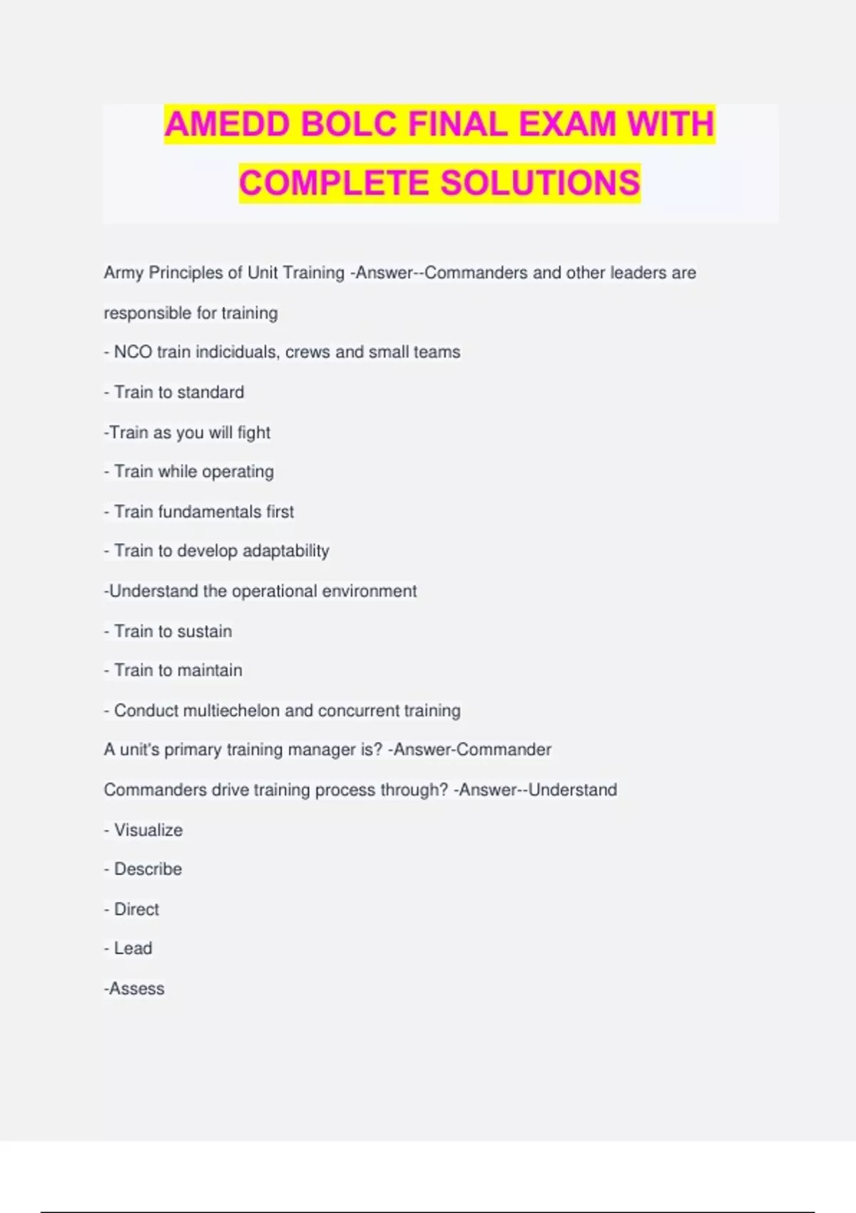 AMEDD BOLC FINAL EXAM WITH COMPLETE SOLUTIONS Army Principles of Unit Training -Answer--Commanders and other leaders are responsible for training - NCO train indiciduals, crews and small teams - Train to standard -Train as you will fight - Train while operating - Train fundamentals first - Train to develop adaptability -Understand the operational environment - Train to sustain - Train to maintain - Conduct multiechelon and concurrent training A unit's primary training manager is? -Answer-Commander Commanders drive training process through? -Answer--Understand - Visualize - Describe - Direct - Lead -Assess Mission-essential task (MET) -Answer-A task a unit could perform based on its design,equipment,manning, and table of organizaation and equipment Mission-essential task list (METL) -Answer-Compilation of mission essential tasks Collective tasks -Answer-Clearly defined, discrete, and measurable activity, action, or event which requires organized team or unit performance and leads to accomplishment of a mission or function Who approves Standard Decisive Action METL for like type units and echelons down to the company level? -Answer-Headquarters, Department of the Army (HQDA) Individual tasks include -Answer--Common soldier task -Leader task -Common skill level task - Organizational level task Military Decision Making process (MDMP) -Answer-Army's operation planning method use for commands WITH a coordinating staff Troop Leading Procedures (TLP) -Answer-Army's operations planning and execution process for units WITHOUT a coordinating staff T/F the Unit training plan (UTP) is the product of MDMP and TLP -Answer-True What facilitates the development of the unit's "Long-Range" training calender? -Answer- UTP (Unit Training plan) Training focus on units in RED -Answer-Maximizing self development opportunities to improve leader and individual task proficiency Training on units in AMBER -Answer-Training proficiency at the individual, leader, crew, and squad levels Training on units in GREEN -Answer-Multi-echelon, collective training that leads to METL proficiency Where can commanders and leader post and view vital unit and individual training documents and data? -Answer-DTMS Eight-Step training model -Answer-1. Plan the training 2. Train and Certify leaders 3. Recon the training site 4. Issue the OPORD 5. Rehearse 6. Execute the training 7. Conduct an AAR 8. Retrain/Retry (as necessary) Ideally training is executed using what approach? -Answer-Crawl-walk-run T/F The recovery process is an extension of a training event -Answer-TRUE T/F Training events are not complete until the unit has recovered -Answer-TRUE 3 types of training assessments -Answer-1. Unit 2. Training 3. Leader Training and evaluation outlines (T&EOs) -Answer-Provide the proponent established standards of nearly all collevtive and individual tasks in the army 4 types of evaluations -Answer-1. Informal Evaluation 2. Formal evaluation 3. Internal evaluation 4. External evaluation 4 parts of AAR -Answer-1. Review what was supposed to happen 2. Establish what happened 3. Determine what was right or wrong 4. Determine how the task should be done differently next tim