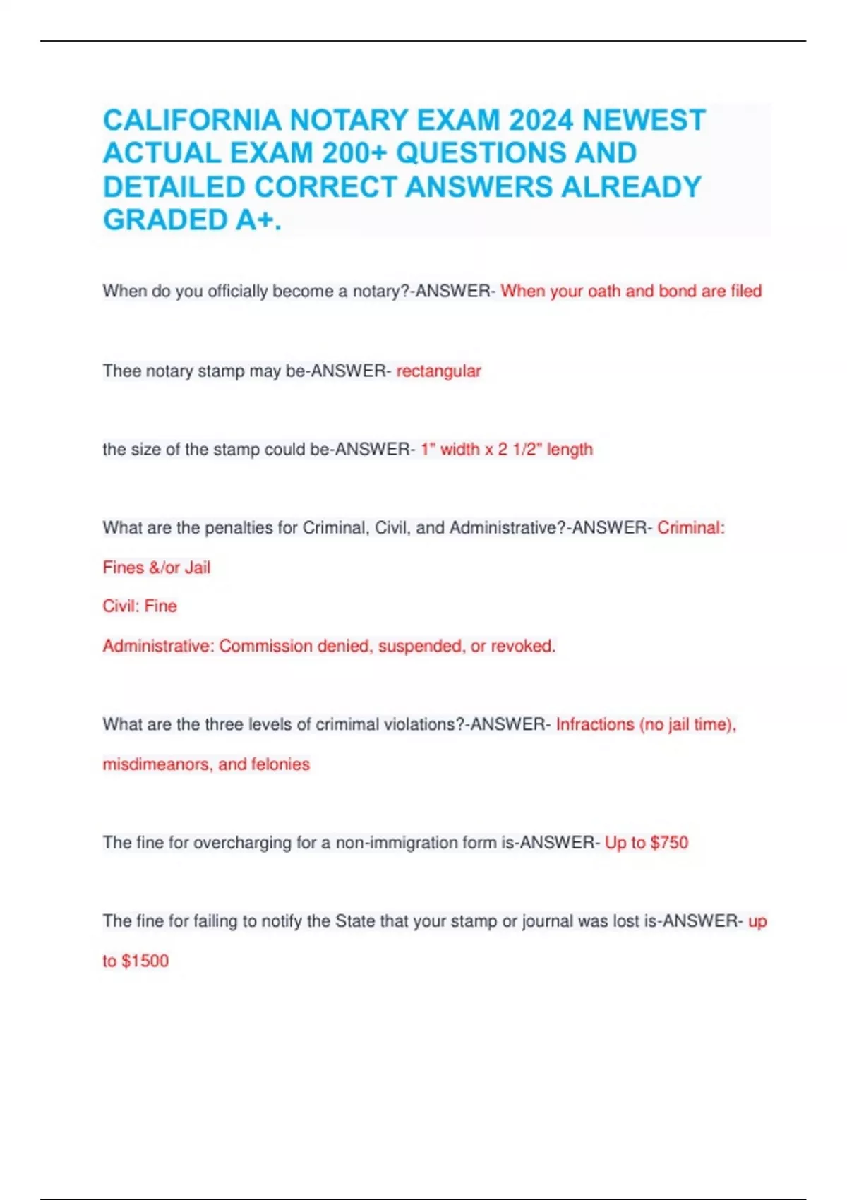 CALIFORNIA NOTARY EXAM 2024 NEWEST ACTUAL EXAM 200+ QUESTIONS AND DETAILED CORRECT ANSWERS ALREADY GRADED A+.