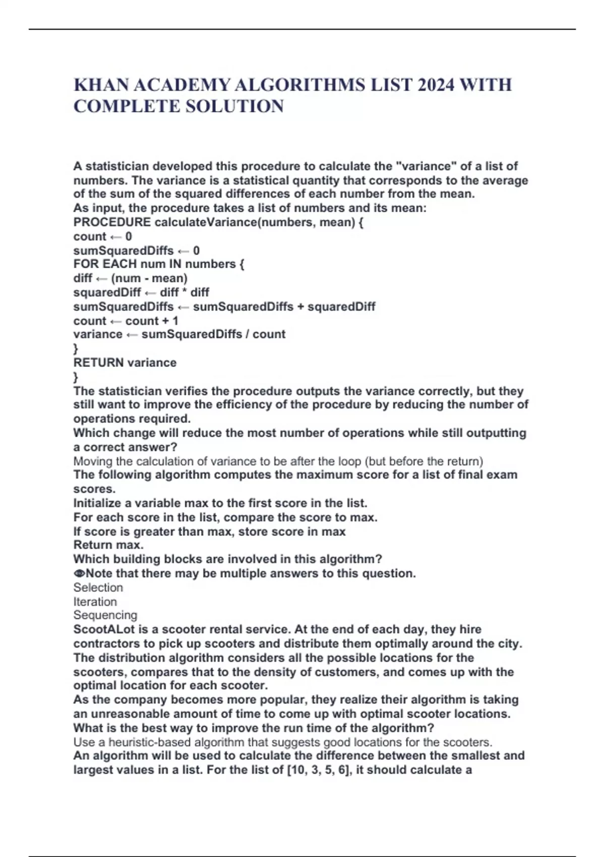 KHAN ACADEMY ALGORITHMS LIST 2024 WITH COMPLETE SOLUTION A statistician developed this procedure to calculate the "variance" of a list of numbers. The variance is a statistical quantity that corresponds to the average of the sum of the squared differences of each number from the mean. As input, the procedure takes a list of numbers and its mean: PROCEDURE calculateVariance(numbers, mean) { count ← 0 sumSquaredDiffs ← 0 FOR EACH num IN numbers { diff ← (num - mean) squaredDiff ← diff * diff sumSquaredDiffs ← sumSquaredDiffs + squaredDiff count ← count + 1 variance ← sumSquaredDiffs / count } RETURN variance } The statistician verifies the procedure outputs the variance correctly, but they still want to improve the efficiency of the procedure by reducing the number of operations required. Which change will reduce the most number of operations while still outputting a correct answer? Moving the calculation of variance to be after the loop (but before the return) The following algorithm computes the maximum score for a list of final exam scores. Initialize a variable max to the first score in the list. For each score in the list, compare the score to max. If score is greater than max, store score in max Return max. Which building blocks are involved in this algorithm? ️Note that there may be multiple answers to this question. Selection Iteration Sequencing ScootALot is a scooter rental service. At the end of each day, they hire contractors to pick up scooters and distribute them optimally around the city. The distribution algorithm considers all the possible locations for the scooters, compares that to the density of customers, and comes up with the optimal location for each scooter. As the company becomes more popular, they realize their algorithm is taking an unreasonable amount of time to come up with optimal scooter locations. What is the best way to improve the run time of the algorithm? Use a heuristic-based algorithm that suggests good locations for the scooters. An algorithm will be used to calculate the difference between the smallest and largest values in a list. For the list of [10, 3, 5, 6], it should calculate a