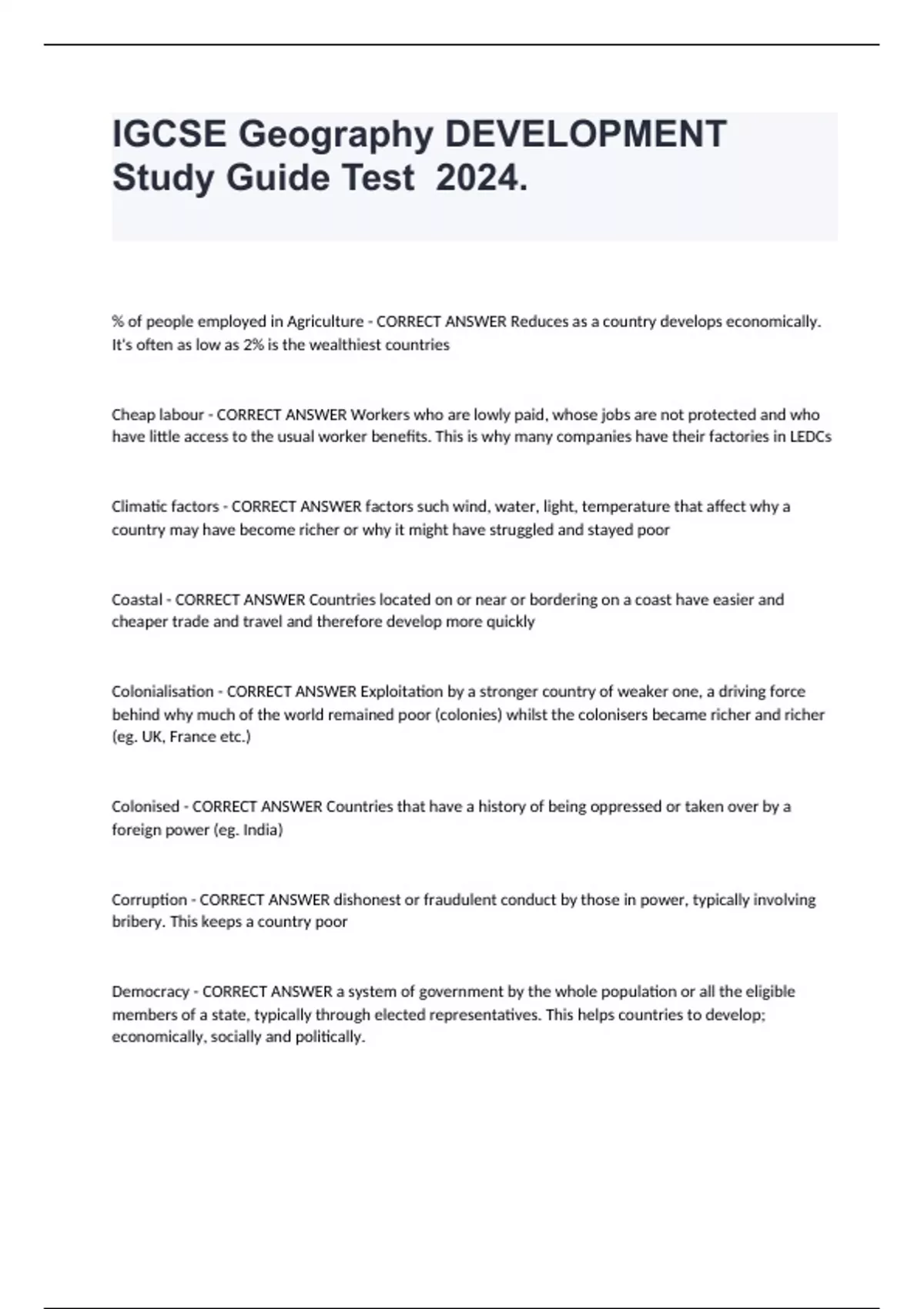 IGCSE Geography DEVELOPMENT Study Guide Test 2024. % of people employed in Agriculture - CORRECT ANSWER Reduces as a country develops economically. It's often as low as 2% is the wealthiest countries Cheap labour - CORRECT ANSWER Workers who are lowly paid, whose jobs are not protected and who have little access to the usual worker benefits. This is why many companies have their factories in LEDCs Climatic factors - CORRECT ANSWER factors such wind, water, light, temperature that affect why a country may have become richer or why it might have struggled and stayed poor Coastal - CORRECT ANSWER Countries located on or near or bordering on a coast have easier and cheaper trade and travel and therefore develop more quickly Colonialisation - CORRECT ANSWER Exploitation by a stronger country of weaker one, a driving force behind why much of the world remained poor (colonies) whilst the colonisers became richer and richer (eg. UK, France etc.) Colonised - CORRECT ANSWER Countries that have a history of being oppressed or taken over by a foreign power (eg. India) Corruption - CORRECT ANSWER dishonest or fraudulent conduct by those in power, typically involving bribery. This keeps a country poor Democracy - CORRECT ANSWER a system of government by the whole population or all the eligible members of a state, typically through elected representatives. This helps countries to develop; economically, socially and politically.