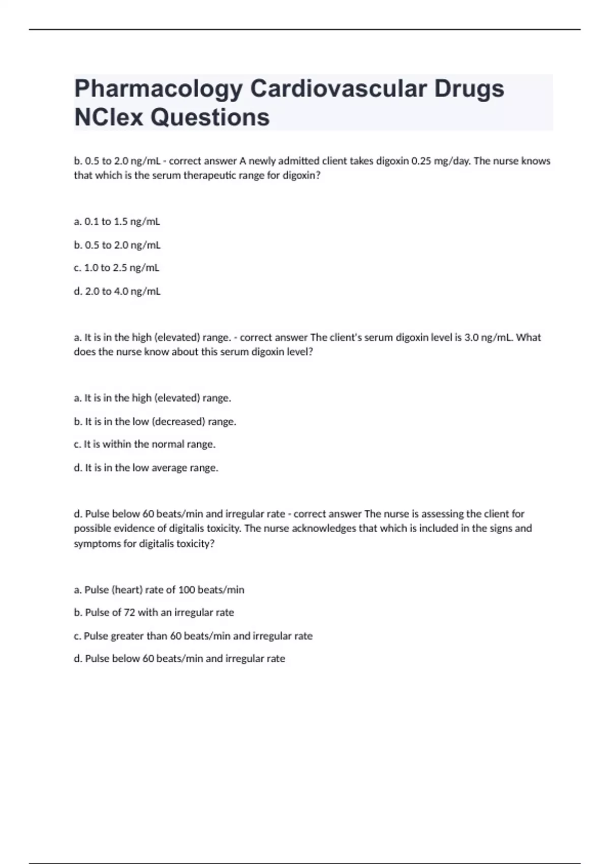Pharmacology Cardiovascular Drugs NClex Questionsb. 0.5 to 2.0 ng/mL - correct answer A newly admitted client takes digoxin 0.25 mg/day. The nurse knows that which is the serum therapeutic range for digoxin? a. 0.1 to 1.5 ng/mL b. 0.5 to 2.0 ng/mL c. 1.0 to 2.5 ng/mL d. 2.0 to 4.0 ng/mL a. It is in the high (elevated) range. - correct answer The client's serum digoxin level is 3.0 ng/mL. What does the nurse know about this serum digoxin level? a. It is in the high (elevated) range. b. It is in the low (decreased) range. c. It is within the normal range. d. It is in the low average range. d. Pulse below 60 beats/min and irregular rate - correct answer The nurse is assessing the client for possible evidence of digitalis toxicity. The nurse acknowledges that which is included in the signs and symptoms for digitalis toxicity? a. Pulse (heart) rate of 100 beats/min b. Pulse of 72 with an irregular rate c. Pulse greater than 60 beats/min and irregular rate d. Pulse below 60 beats/min and irregular rate