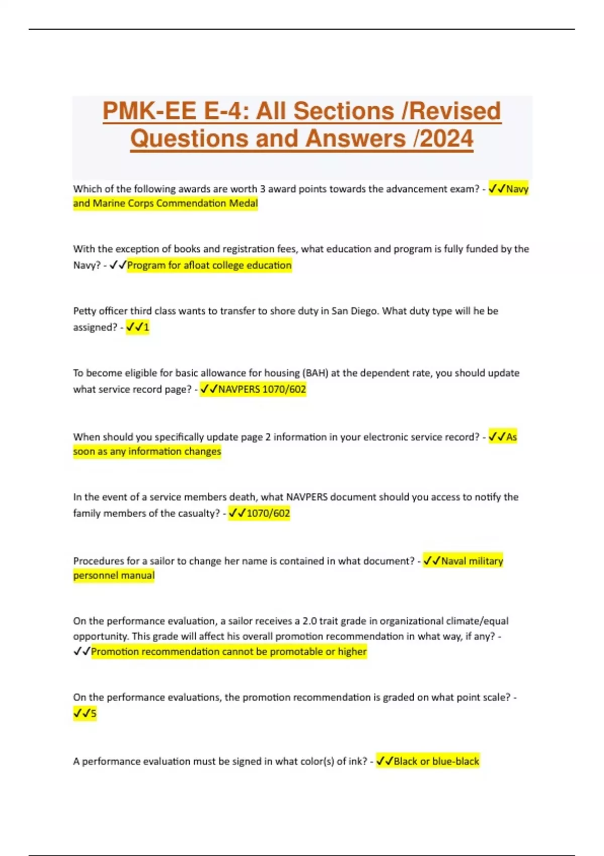 Which of the following awards are worth 3 award points towards the advancement exam? - Navy and Marine Corps Commendation Medal With the exception of books and registration fees, what education and program is fully funded by the Navy? - Program for afloat college education Petty officer third class wants to transfer to shore duty in San Diego. What duty type will he be assigned? - 1 To become eligible for basic allowance for housing (BAH) at the dependent rate, you should update what service record page? - NAVPERS 1070/602 When should you specifically update page 2 information in your electronic service record? - As soon as any information changes In the event of a service members death, what NAVPERS document should you access to notify the family members of the casualty? - 1070/602 Procedures for a sailor to change her name is contained in what document? - Naval military personnel manual On the performance evaluation, a sailor receives a 2.0 trait grade in organizational climate/equal opportunity. This grade will affect his overall promotion recommendation in what way, if any? - Promotion recommendation cannot be promotable or higher On the performance evaluations, the promotion recommendation is graded on what point scale? - 5 A performance evaluation must be signed in what color(s) of ink? - Black or blue-black On performance evaluations, performance traits are graded on what total point scale? - 5 A baccalaureate degree from an accredited institution is the minimum requirement to request commissioning to which of the following officer programs? - Officer Candidate School Program A prior service member can maintain eligibility for golden ticket return to service for what period of time? - Up to 1 year as long as they remain fully qualified To qualify for an exchange of duty with another sailor, the total cost of the duty exchange can NOT exceed what total dollar amount? - 1000$ For members eligible to take the E-4 exam, which of the following individuals prepare the worksheet? - Education Services Officer Prior to transferring to a service school, a careerist should spend what minimum number of months onboard a command? - 24 The orders negotiation window opens for a sailor at what specific number of months before PRD? - 12 Armed Services Vocational Aptitude Battery (ASVAB) scores are entered on what service record page? - NAVPERS 1070/604 or NAVPERS 1070/88