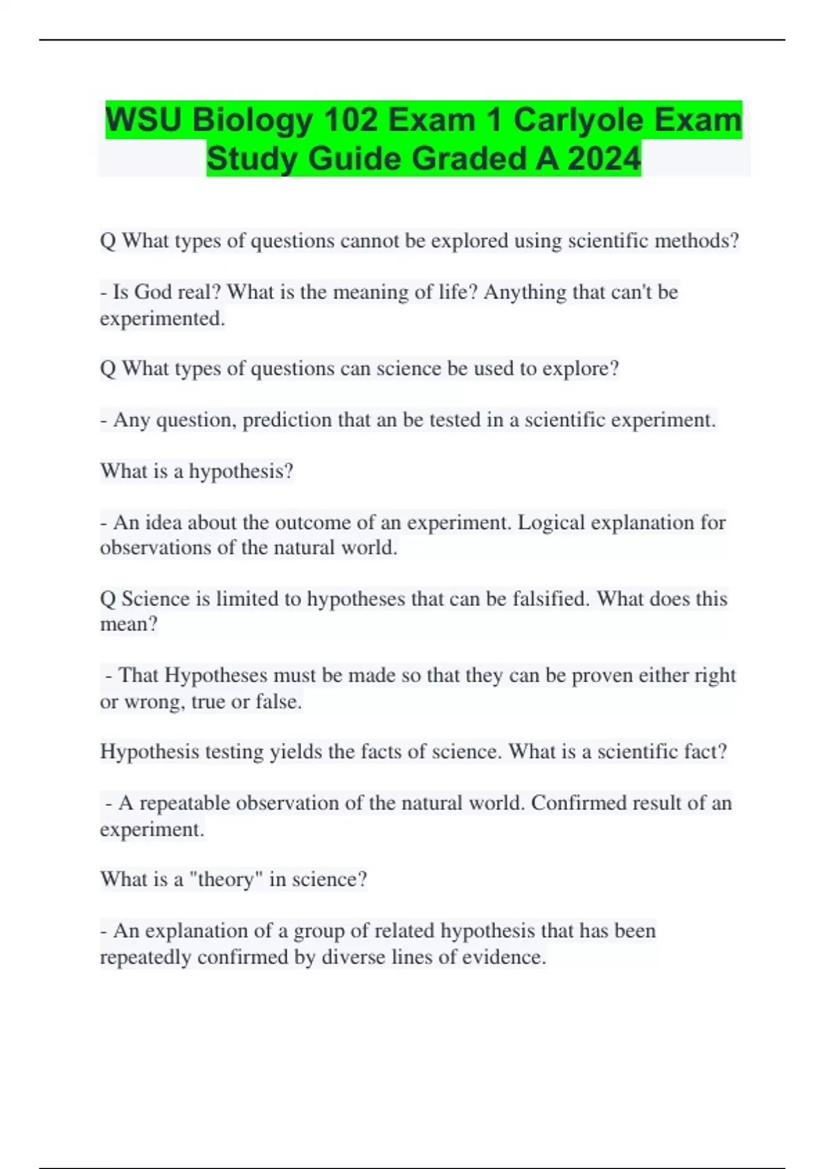 WSU Biology 102 Exam 1 Carlyole Exam Study Guide Graded A 2024