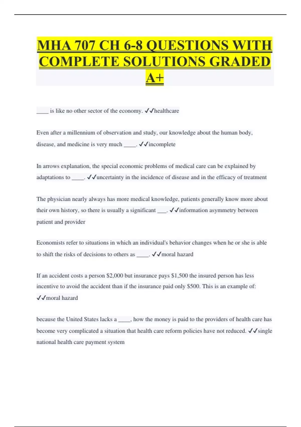 MHA 707 CH 6-8 QUESTIONS WITH COMPLETE SOLUTIONS GRADED A+ ____ is like no other sector of the economy. healthcare Even after a millennium of observation and study, our knowledge about the human body, disease, and medicine is very much ____. incomplete In arrows explanation, the special economic problems of medical care can be explained by adaptations to ____. uncertainty in the incidence of disease and in the efficacy of treatment The physician nearly always has more medical knowledge, patients generally know more about their own history, so there is usually a significant ___. information asymmetry between patient and provider Economists refer to situations in which an individual's behavior changes when he or she is able to shift the risks of decisions to others as ____. moral hazard If an accident costs a person $2,000 but insurance pays $1,500 the insured person has less incentive to avoid the accident than if the insurance paid only $500. This is an example of: moral hazard