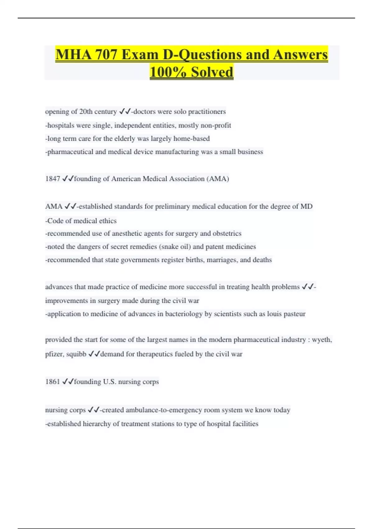 MHA 707 Exam D-Questions and Answers 100% Solved opening of 20th century -doctors were solo practitioners -hospitals were single, independent entities, mostly non-profit -long term care for the elderly was largely home-based -pharmaceutical and medical device manufacturing was a small business 1847 founding of American Medical Association (AMA) AMA -established standards for preliminary medical education for the degree of MD -Code of medical ethics -recommended use of anesthetic agents for surgery and obstetrics -noted the dangers of secret remedies (snake oil) and patent medicines -recommended that state governments register births, marriages, and deaths advances that made practice of medicine more successful in treating health problems - improvements in surgery made during the civil war -application to medicine of advances in bacteriology by scientists such as louis pasteur provided the start for some of the largest names in the modern pharmaceutical industry : wyeth, pfizer, squibb demand for therapeutics fueled by the civil war 1861 founding U.S. nursing corps
