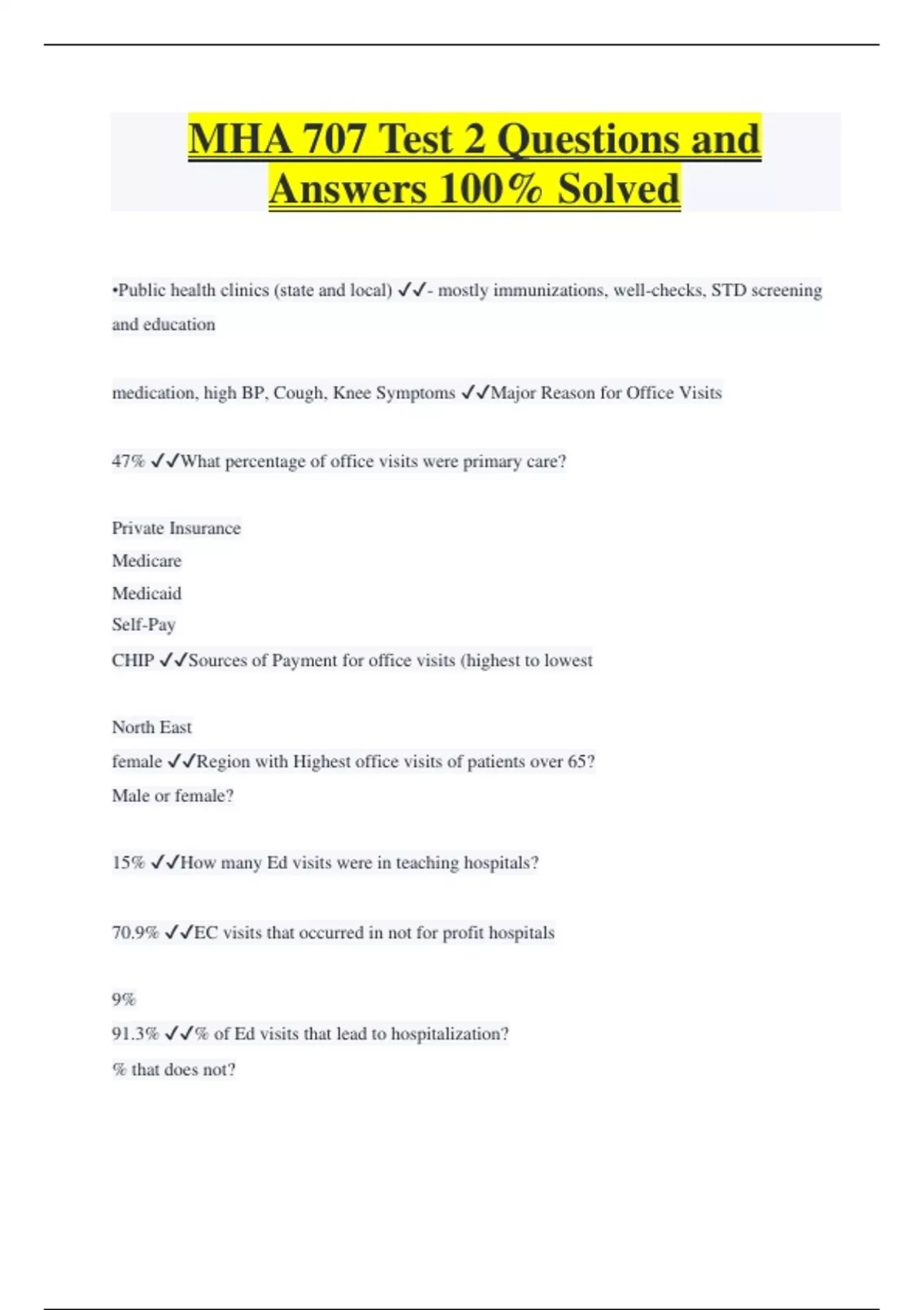 MHA 707 Test 2 Questions and Answers 100% Solved •Public health clinics (state and local) - mostly immunizations, well-checks, STD screening and education medication, high BP, Cough, Knee Symptoms Major Reason for Office Visits 47% What percentage of office visits were primary care? Private Insurance Medicare Medicaid Self-Pay CHIP Sources of Payment for office visits (highest to lowest North East female Region with Highest office visits of patients over 65? Male or female? 15% How many Ed visits were in teaching hospitals? 70.9% EC visits that occurred in not for profit hospitals 9% 91.3% % of Ed visits that lead to hospitalization? % that does not?