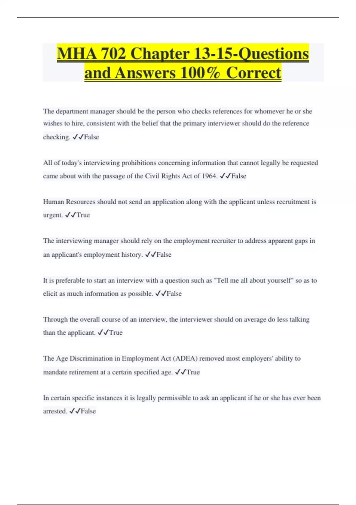 MHA 702 Chapter 13-15-Questions and Answers 100% Correct The department manager should be the person who checks references for whomever he or she wishes to hire, consistent with the belief that the primary interviewer should do the reference checking. False All of today's interviewing prohibitions concerning information that cannot legally be requested came about with the passage of the Civil Rights Act of 1964. False Human Resources should not send an application along with the applicant unless recruitment is urgent. True The interviewing manager should rely on the employment recruiter to address apparent gaps in an applicant's employment history. False It is preferable to start an interview with a question such as "Tell me all about yourself" so as to elicit as much information as possible. False Through the overall course of an interview, the interviewer should on average do less talking than the applicant. True The Age Discrimination in Employment Act (ADEA) removed most employers' ability to mandate retirement at a certain specified age. True
