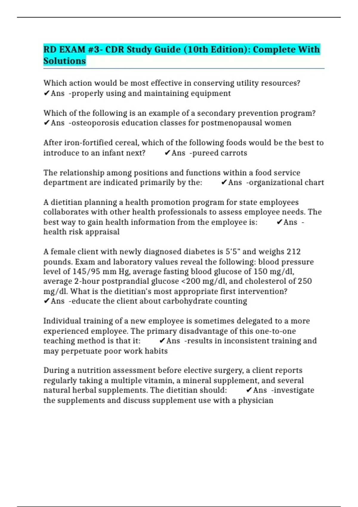 RD EXAM #3- CDR Study Guide (10th Edition): Complete With Solutions