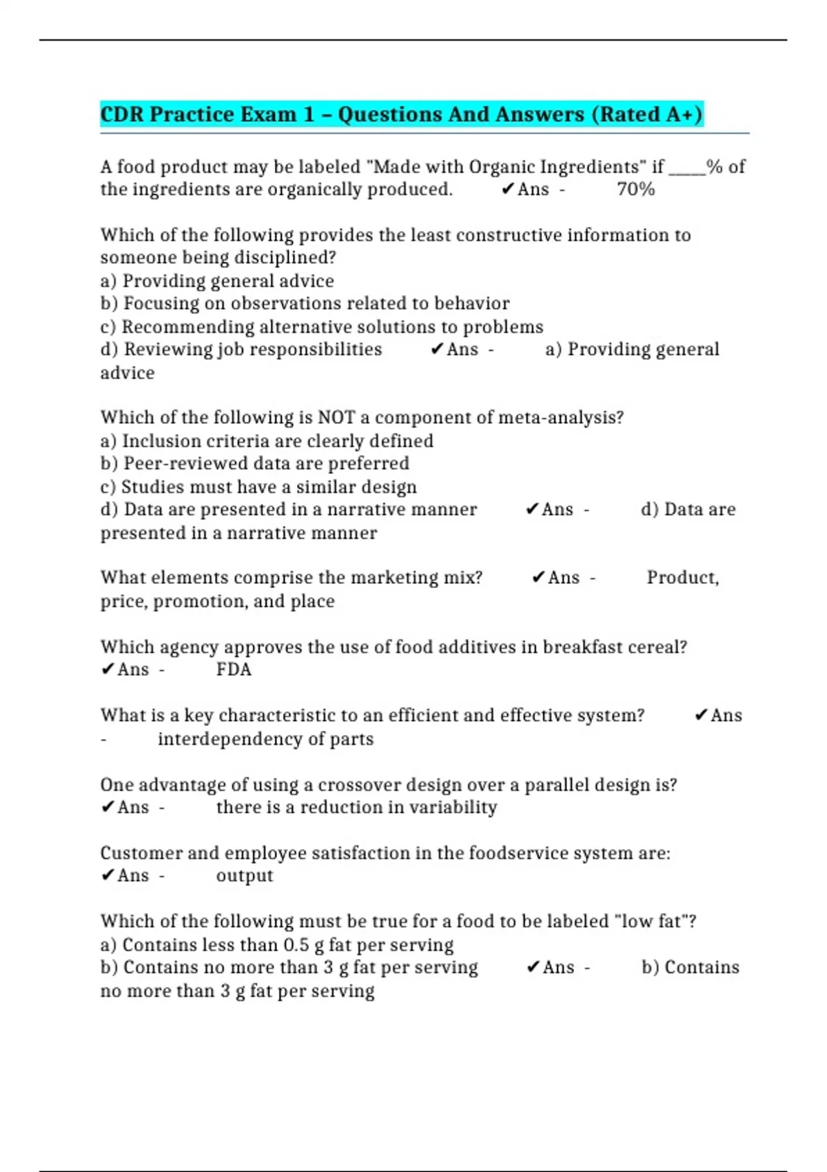 CDR Practice Exam 1 – Questions And Answers (Rated A+)