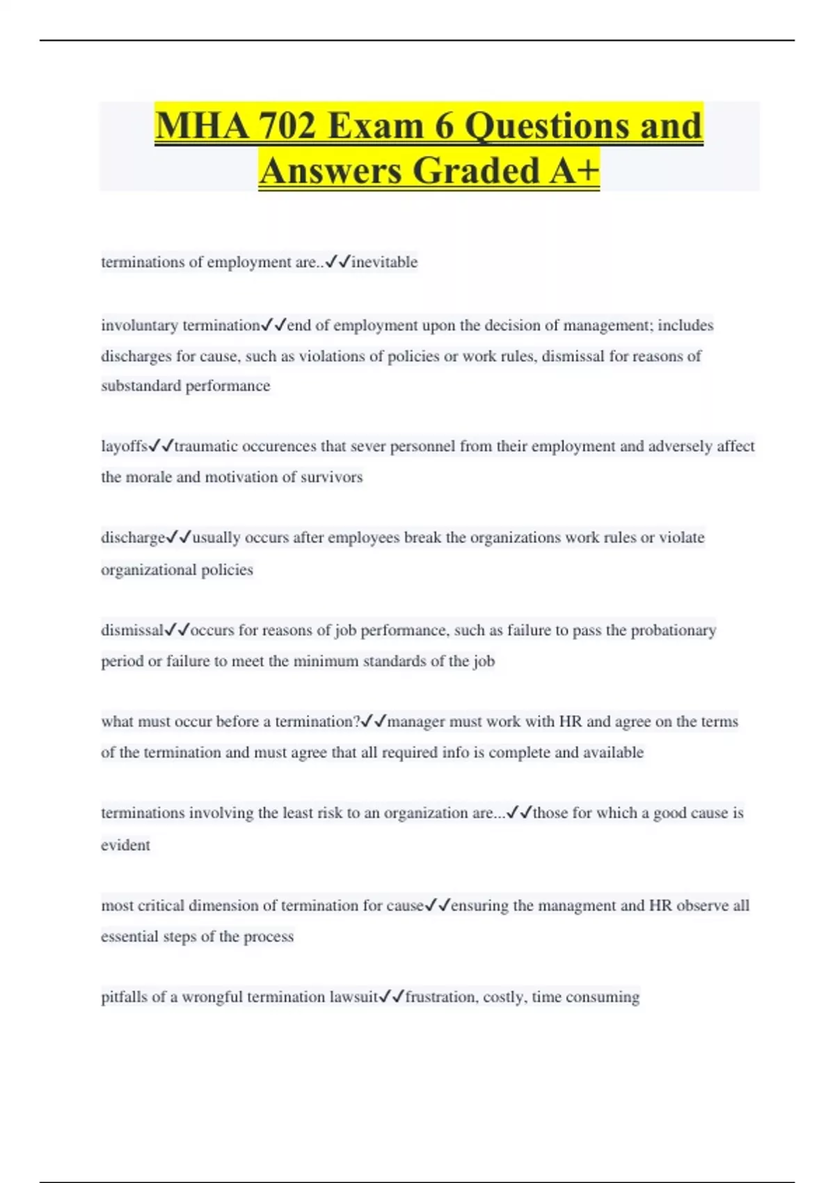 MHA 702 Exam 6 Questions and Answers Graded A+ terminations of employment are..inevitable involuntary terminationend of employment upon the decision of management; includes discharges for cause, such as violations of policies or work rules, dismissal for reasons of substandard performance layoffstraumatic occurences that sever personnel from their employment and adversely affect the morale and motivation of survivors dischargeusually occurs after employees break the organizations work rules or violate organizational policies dismissaloccurs for reasons of job performance, such as failure to pass the probationary period or failure to meet the minimum standards of the job what must occur before a termination?manager must work with HR and agree on the terms of the termination and must agree that all required info is complete and available terminations involving the least risk to an organization are...those for which a good cause is evident most critical dimension of termination for causeensuring the managment and HR observe all essential steps of the process