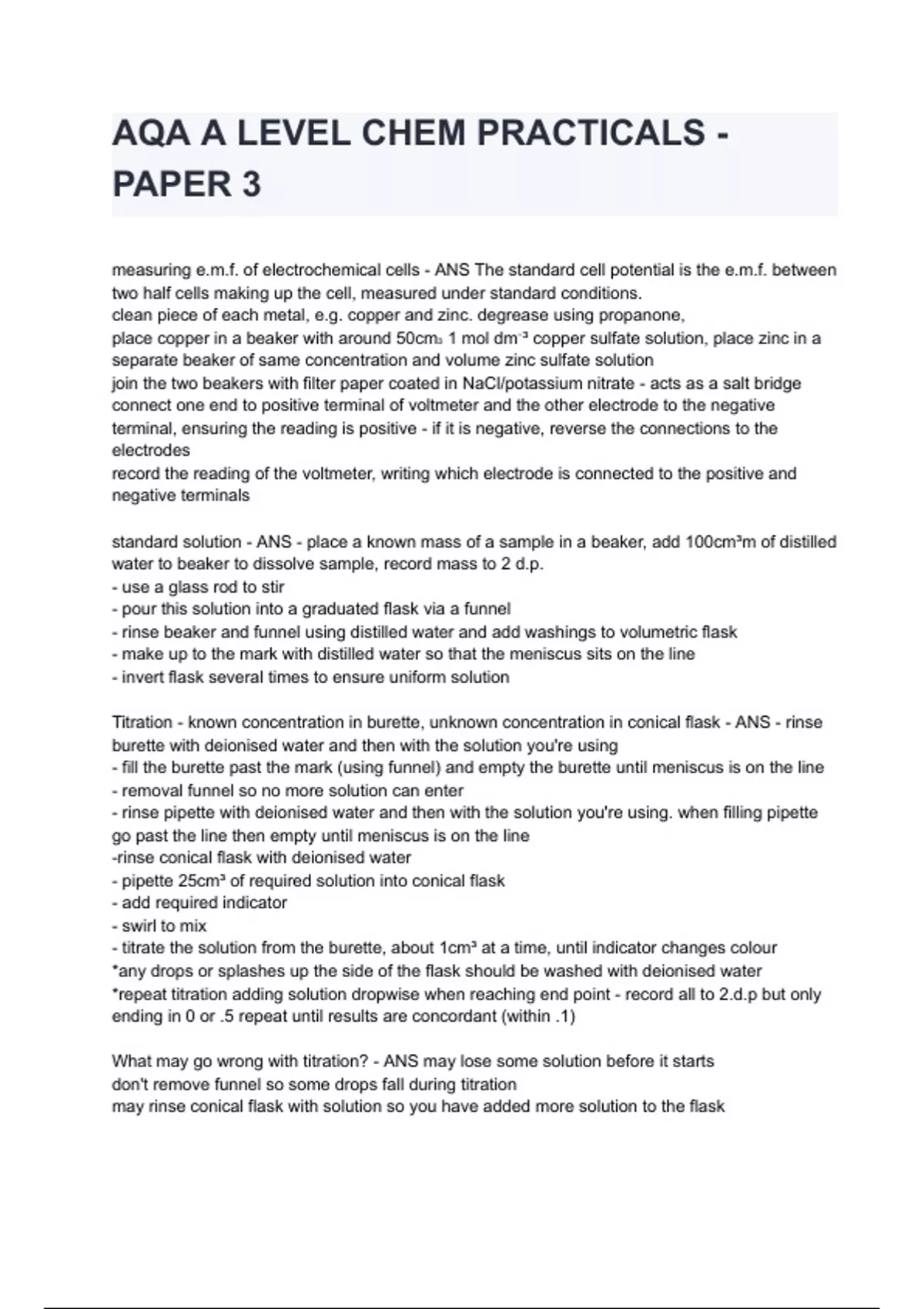 AQA A LEVEL CHEM PRACTICALS - PAPER 3 Exam 2024/2025 Questions & Answers Already Graded A.