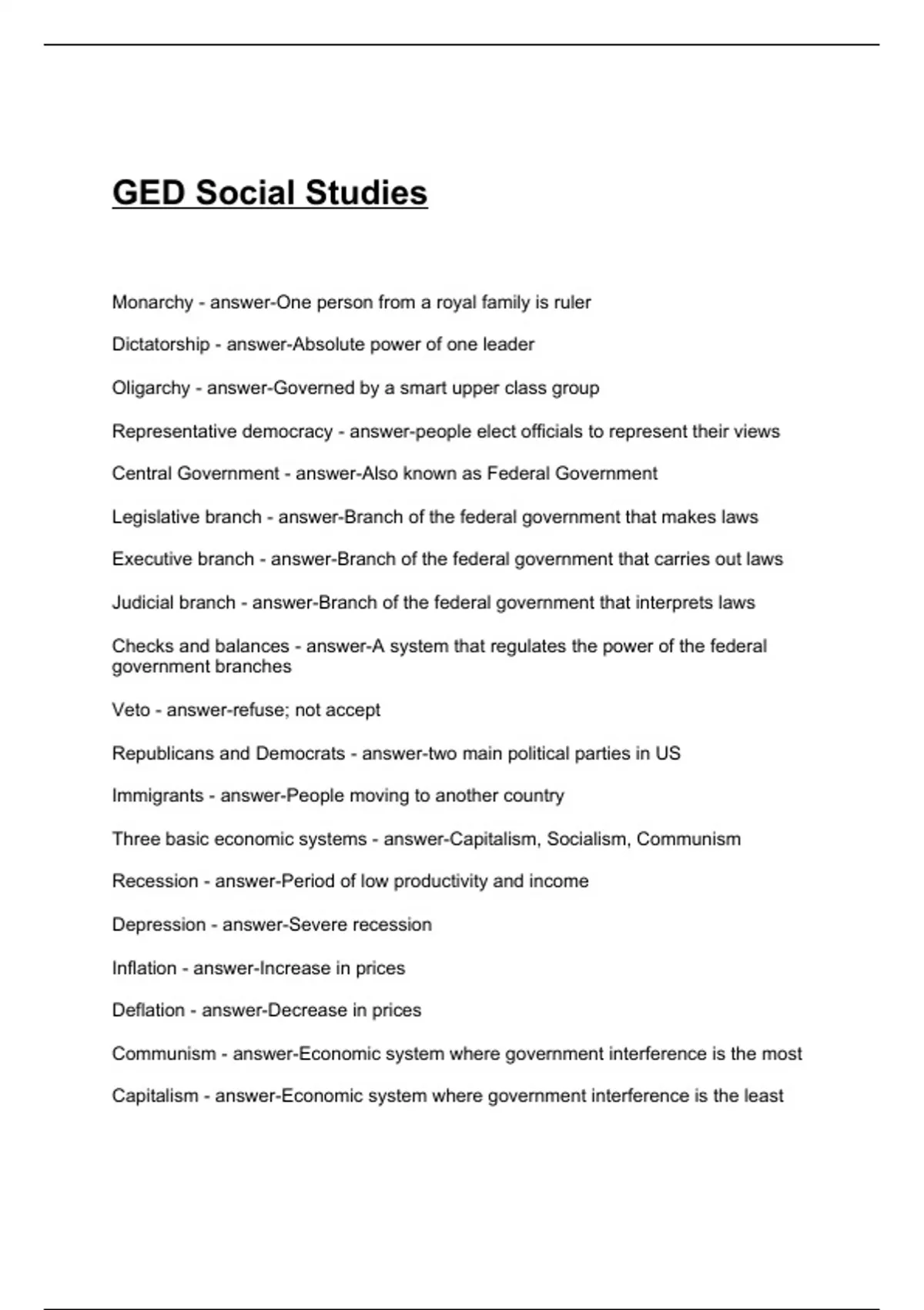 Monarchy - answer-One person from a royal family is ruler Dictatorship - answer-Absolute power of one leader Oligarchy - answer-Governed by a smart upper class group Representative democracy - answer-people elect officials to represent their views Central Government - answer-Also known as Federal Government Legislative branch - answer-Branch of the federal government that makes laws Executive branch - answer-Branch of the federal government that carries out laws Judicial branch - answer-Branch of the federal government that interprets laws Checks and balances - answer-A system that regulates the power of the federal government branches Veto - answer-refuse; not accept Republicans and Democrats - answer-two main political parties in US Immigrants - answer-People moving to another country Three basic economic systems - answer-Capitalism, Socialism, Communism Recession - answer-Period of low productivity and income Depression - answer-Severe recession Inflation - answer-Increase in prices Deflation - answer-Decrease in prices Communism - answer-Economic system where government interference is the most Capitalism - answer-Economic system where government interference is the least Federal Reserve System - answer-Keeps economy in balance Gross Domestic Product (GDP) - answer-Total value of goods and services produced; is used to measure economic growth Gross National Product (GNP) - answer-Indicator of GDP plus foreign investments Consumer Price Index (CPI) - answer-Measures changes in cost of living Topographical Maps - answer-Maps that give details about land Elevation - answer-How high something is Equator - answer-Central horizontal line on the globe Prime Meridian - answer-Central vertical line on the globe