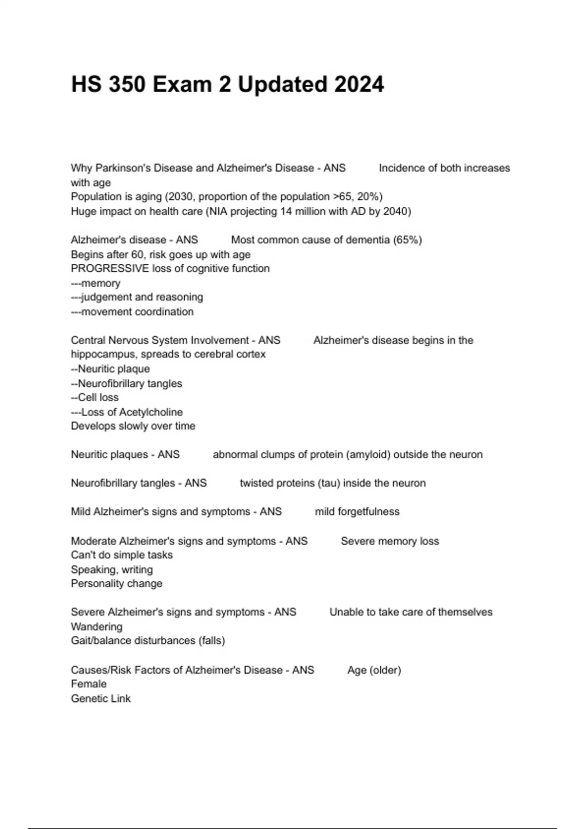 Why Parkinson's Disease and Alzheimer's Disease - ANS Incidence of both increases with age Population is aging (2030, proportion of the population >65, 20%) Huge impact on health care (NIA projecting 14 million with AD by 2040) Alzheimer's disease - ANS Most common cause of dementia (65%) Begins after 60, risk goes up with age PROGRESSIVE loss of cognitive function ---memory ---judgment and reasoning ---movement coordination Central Nervous System Involvement - ANS Alzheimer's disease begins in the hippocampus, spreads to cerebral cortex --Neuritic plaque --Neurofibrillary tangles --Cell loss ---Loss of Acetylcholine Develops slowly over time Neuritic plaques - ANS abnormal clumps of protein (amyloid) outside the neuron Neurofibrillary tangles - ANS twisted proteins (tau) inside the neuron Mild Alzheimer's signs and symptoms - ANS mild forgetfulness Moderate Alzheimer's signs and symptoms - ANS Severe memory loss Can't do simple tasks Speaking, writing Personality change Severe Alzheimer's signs and symptoms - ANS Unable to take care of themselves Wandering Gait/balance disturbances (falls) Causes/Risk Factors of Alzheimer's Disease - ANS Age (older) Female Genetic Link HBP, High cholesterol Sedentary lifestyle Education Genetic link with AD - ANS ApOE4 (double allele) Risk increases 4-fold if first degree relative has AD; risk increases 40 fold if 2 or more first degree relatives have AD Sedentary lifestyle AD - ANS Survey of people with AD and healthy family control of midlife activities --Per