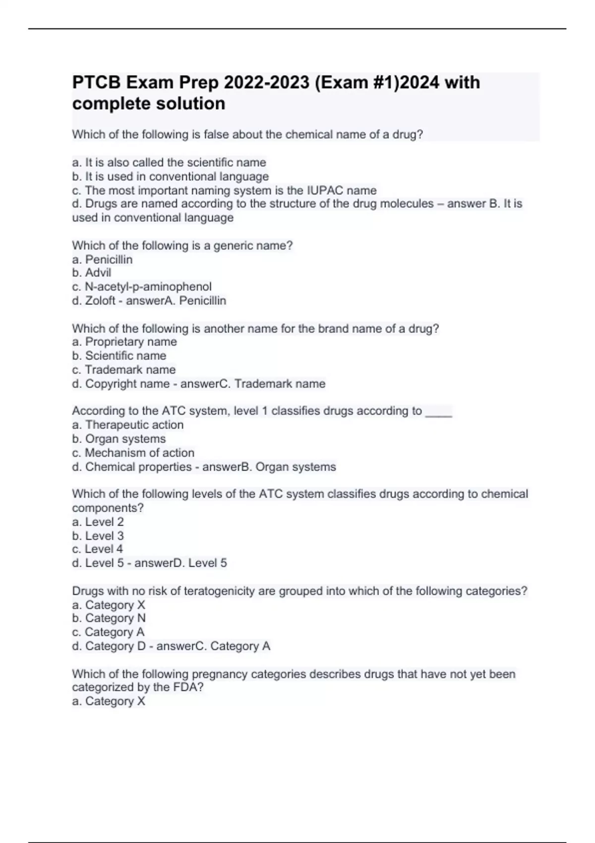 Which of the following is false about the chemical name of a drug? a. It is also called the scientific name b. It is used in conventional language c. The most important naming system is the IUPAC name d. Drugs are named according to the structure of the drug molecules – answer B. It is used in conventional language Which of the following is a generic name? a. Penicillin b. Advil c. N-acetyl-p-aminophenol d. Zoloft - answerA. Penicillin Which of the following is another name for the brand name of a drug? a. Proprietary name b. Scientific name c. Trademark name d. Copyright name - answerC. Trademark name According to the ATC system, level 1 classifies drugs according to ____ a. Therapeutic action b. Organ systems c. Mechanism of action d. Chemical properties - answerB. Organ systems Which of the following levels of the ATC system classifies drugs according to chemical components? a. Level 2 b. Level 3 c. Level 4 d. Level 5 - answerD. Level 5 Drugs with no risk of teratogenicity are grouped into which of the following categories? a. Category X b. Category N c. Category A d. Category D - answerC. Category A Which of the following pregnancy categories describes drugs that have not yet been categorized by the FDA? a. Category X b. Category N c. Category A d. Category D - answerB. Category N Which of the following false about schedule I drugs? a. They have a high potential for abuse and addiction b. They are safe for medical use only under strict medical supervision c. Heroin is an example d. Psilocybin is an example - answerB. They are safe for medical use only under strict medical supervision Which of the following is a schedule II drug? a. Mescaline b. Cathinone c. Phencyclidine d. Ketamine - answerC. Phencyclidine Concerning LASA medications, what is the most appropriate description? a. Medications that have similarities in shape only b. Medications that have similarities in name only c. Medications that appear similar in chemical properties d. Medications that are similar in physical structure, packaging and drug names with similar spellings or pronunciation - answerD. Medications that are similar in physical structure, packaging and drug names with similar spellings or pronunciation Which of the following is not a risk factor associated with LASA medications? a. Illegible writing b. Incomplete knowledge of drug names c. Medications with different clinical uses d. Similar packaging and label - answerC. Medications with different clinical uses Which of the following is a strategy used to reduce error during procurement of LASA medications? a. Tall man lettering b. Encouraging the availability of multiple medicine strengths c. Reducing the availability of multiple medicine strengths d. Additional warning labels - answerC. Reducing the availability of multiple medicine strengths The act of writing part of the name of a medication in upper case to help differentiate LASA medications is called: a. Slow man letterings b. Upper case lettering c. Legible writing d. Tall man lettering - answerD. Tall man lettering Which of the following is not an example of drug pairs with tall man lettering? a. metFORMIN and metoPROLOL b. nitroGLYCERINe and nitroPRUSSIDe c. LOsartan and LOvastatin d. ACETAminophen and ACETALdehyde - answerD. ACETAminophen and ACETALdehyde Which of the following is false about the metric system of measurement? a. It is commonly used at home b. It is the legal system of measurement in the United States c. It uses the decimal system d. It includes the gram, meter, and liter - answerA. It is commonly used at home Which of the following measurement systems is also known as the Avoirdupois System? a. The metric system b. The international unit system c. The household system d. The apothecary system - answerC. The household system Which of the following statements is false concerning triangle checks in LASA medications? a. You should check the actual medicines against the medication label b. You should check the actual medications against the prescription c. You should identify medication only by physical appearance d. It is done during administration and dispensation of drugs - answerC. You should identify medication only by physical appearance Which of the following best describes a Class A prescription balance? a. A device used to measure large quantities of material and drugs above 5kg b. A balance that is usually composed of a single pan c. A measuring device used to weigh quantities that are not more than 120g d. A balance used for mixing certain compounds - answerC. A measuring device used to weigh quantities that are not more than 120g Concerning conical graduates, which of the following is true? a. They are used in the measurement of liquids that have wide bases and wide tops and taper from the top to bottom b. They are useful when measuring liquids that have narrow diameters at the top and base c. They are usually in the form of plates made up of hard, flat, and nonabsorbent surfaces d. They are used in the measurement of solid drugs - answerA. They are used in the measurement of liquids that have wide bases and wide tops and taper from the top to bottom Which of the following may be referred to as compounding 1 - Preparation of radioactive isotopes 2 - Preparation of suppositories, oral liquids and topical medications 3 - Conversion from one dosage form to another a. 2 only b. 2 and 3 c. 3 only d. 1, 2, and 3 - answerD. 1, 2 and 3 Which of the following materials is incorrectly paired with its use? a. Heat guns - Used to shrink bands onto vials b. Decappers - Used to remove seals on containers c. Beakers - Used to hold liquids d. Hot plates - Used for drying tablets during compounding - answerD. Hot plates - Used for drying tablets during compounding Which of the following is true about formulating suspensions? a. It is easy to maintain the physical stability of suspensions after compounding b. It does not require the process of trituration c. Suspensions are difficult to co